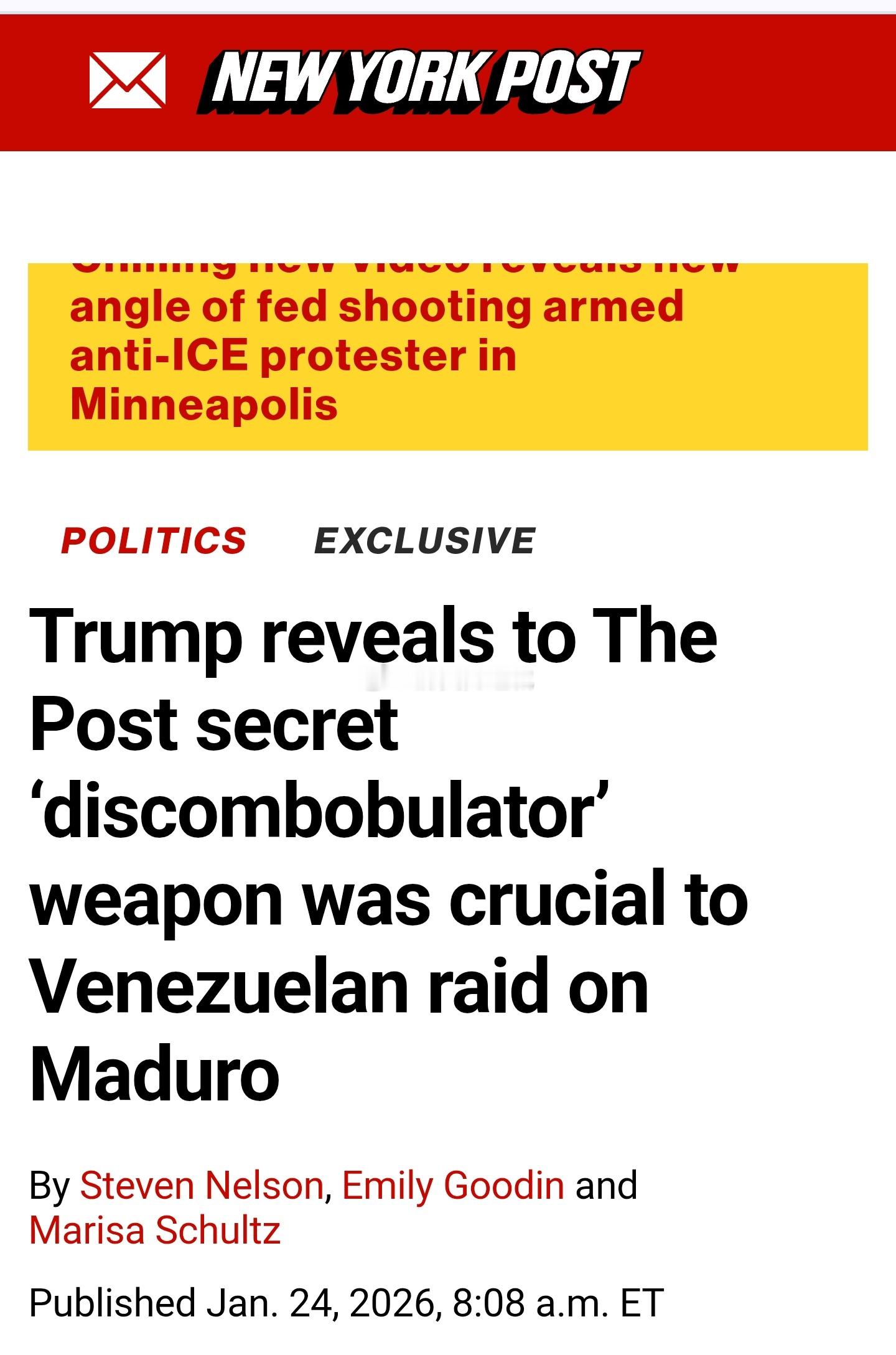 特朗普承认用声波武器绑架马杜罗特朗普告诉《纽约邮报》,一款他称为“扰乱器(discombobulator)”的新武器,是美军成功突袭并俘虏委内瑞拉总统马杜罗的关键。特朗普夸口说,这种神秘武器在“敌方装备失效”“扰乱器。我不被允许谈这个,”特朗普在椭圆形办公室接受专访时表示。“我很想说”,他确认这款武器确实被用于这次秘密行动。“他们连一枚火箭都没发射出去。他们有俄制火箭,但一枚都没发射成功。我们来了之后,他们按按钮,却什么反应都没有。他们本来已经全都准备好了。”特朗普是在被问及美国政府曾购买一种脉冲能量武器的报道时,提到这款武器的。关于武器的公开信息极少。但这些报道似乎和委内瑞拉军队的描述类似:马杜罗的武装人员,“鼻子流血”,甚至呕出血来。一名保镖事后回忆说:“突然,我们所有雷达系统都无故失灵。”“接着我们看到很多无人机飞过我们阵地。我们不知道该如何应对,”他表示,随后有直升机现身,“一共大概八架”,载着约20名美军士兵进入该区域。“他们发射了某种东西,我不知道怎么形容。像是一种极强烈的声波。我突然感觉头从内部炸裂。”“我们全都开始流鼻血,有人吐血。我们倒在地上,动弹不得。那种声波武器——不管它是什么,之后我们连站都站不起来。”海外新鲜事