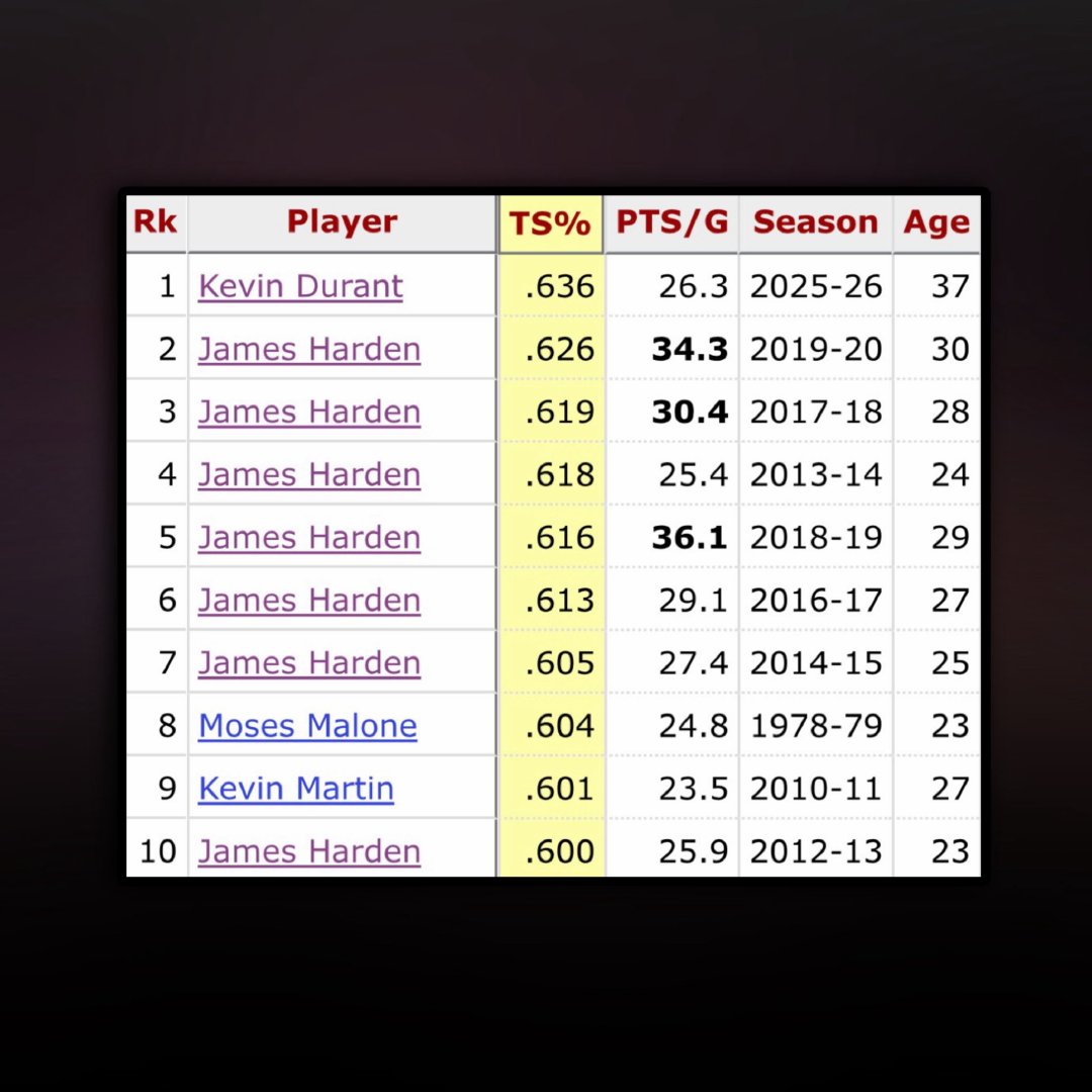 杜兰特目前正打出火箭队史上最高效的场均20+得分赛季:-场均26.3分,真实