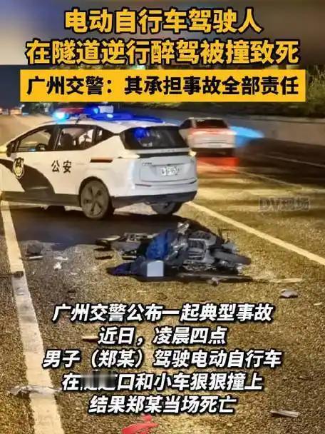 广州凌晨四点的隧道口,郑某醉酒骑电动车逆行撞小车当场身亡,血检酒精134.3mg