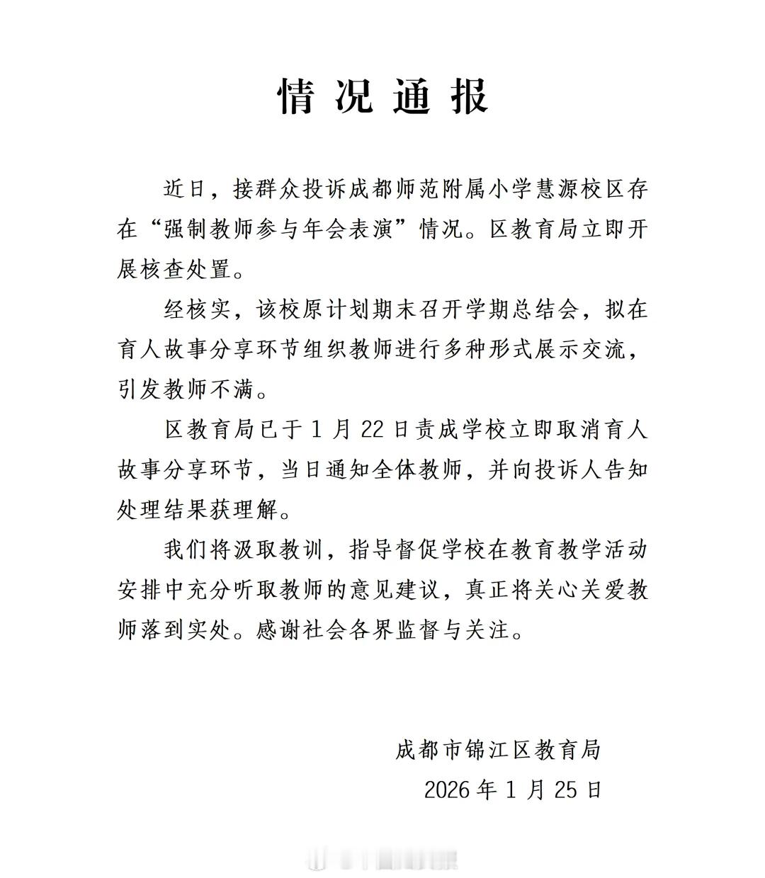 【成都通报小学强制教师参与年会表演】成都市锦江区教育局1月25日通报,近日,接群众投诉成都师范附属小学慧源校区存在“强制教师参与年会表演”情况。区教育局立即开展核查处置。经核实,该校原计划期末召开学期总结会,拟在育人故事分享环节组织教师进行多种形式展示交流,引发教师不满。区教育局已于1月22日责成学校立即取消育人故事分享环节,当日通知全体教师,并向投诉人告知处理结果获理解。