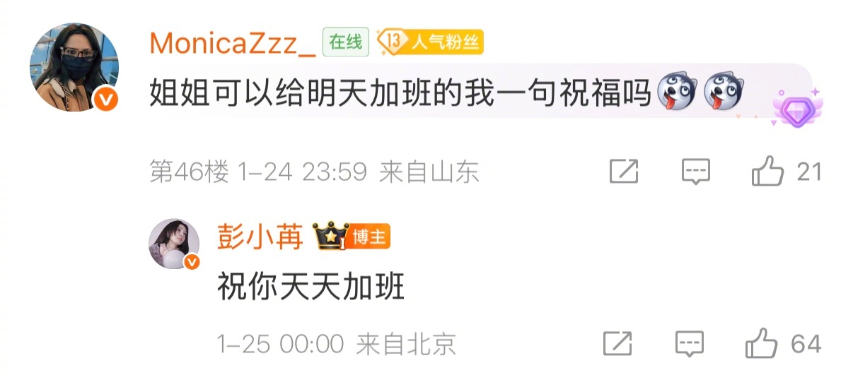 彭小苒:祝你天天加班呃…收到是要原地脱粉的程度😫