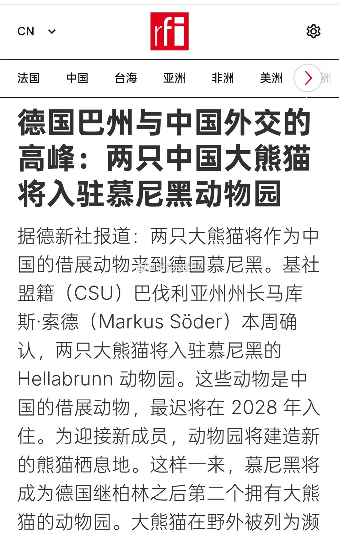 德国基社盟籍巴伐利亚州州长索德本周确认,两只大熊猫将入驻慕尼黑的 Hellabrunn动物园。这些动物是中国的借展动物,最迟将在2028年入住。为迎接新成员,动物园将建造新的熊猫栖息地。这样一来,慕尼黑将成为德国继柏林之后第二个拥有大熊猫的动物园。索德宣布,这两只熊猫是他2024年访华成果的一部分。当时,他为让熊猫来到慕尼黑投入了大量努力。索德表示:熊猫能来慕尼黑“是巴伐利亚与中国外交的高光时刻”。海外新鲜事
