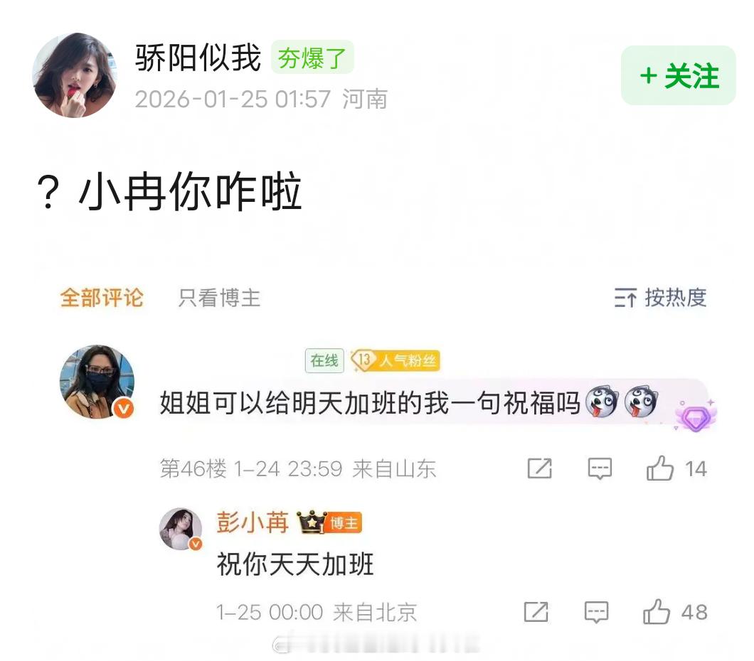 粉丝明天加班希望可以得到彭小苒的祝福彭小苒:祝你天天加班彭小苒祝你天天加班彭