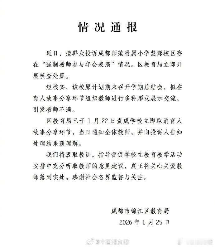 【成都通报小学强制教师参与年会表演】据纵览新闻,成都市锦江区教育局2026年1月25日通报:近日,接群众投诉成都师范附属小学慧源校区存在“强制教师参与年会表演”情况。区教育局立即开展核查处置。经核实,该校原计划期末召开学期总结会,拟在育人故事分享环节组织教师进行多种形式展示交流,引发教师不满。区教育局已于1月22日责成学校立即取消育人故事分享环节,当日通知全体教师,并向投诉人告知处理结果获理解。我们将汲取教训,指导督促学校在教育教学活动安排中充分听取教师的意见建议,真正将关心关爱教师落到实处。感谢社会各界监督与关注。