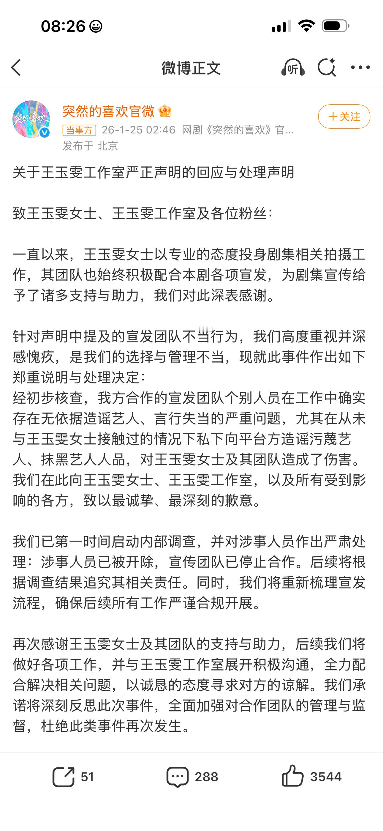 突然的喜欢的回应与处理声明王玉雯不是因为卫生巾切片营销事件 突然的喜欢的的回应与处理声明,咱就说处理好这种剧宣人员的工作,王玉雯不是因为卫生巾切片营销事件,期待剧情见吧!王玉雯方停止突然的喜欢一切宣传工作