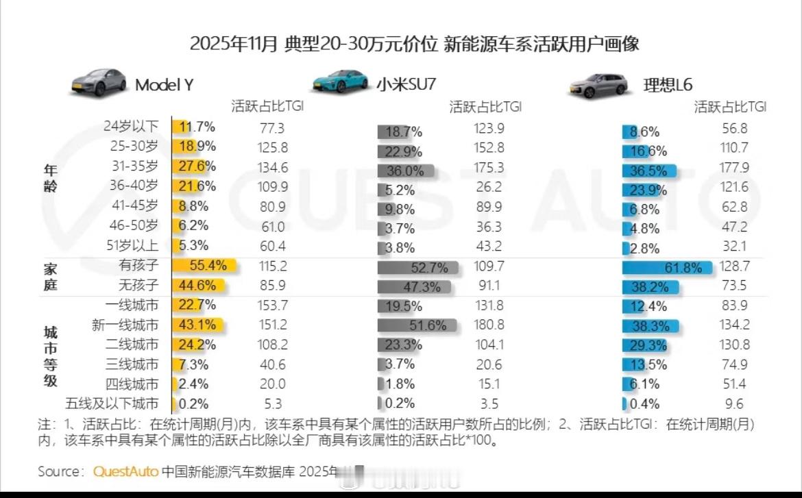 小米su7的用户画像,一线+新一线城市的用户占比71.1%,特斯拉Model Y 占比65.8%,理想L6占比50.7%。