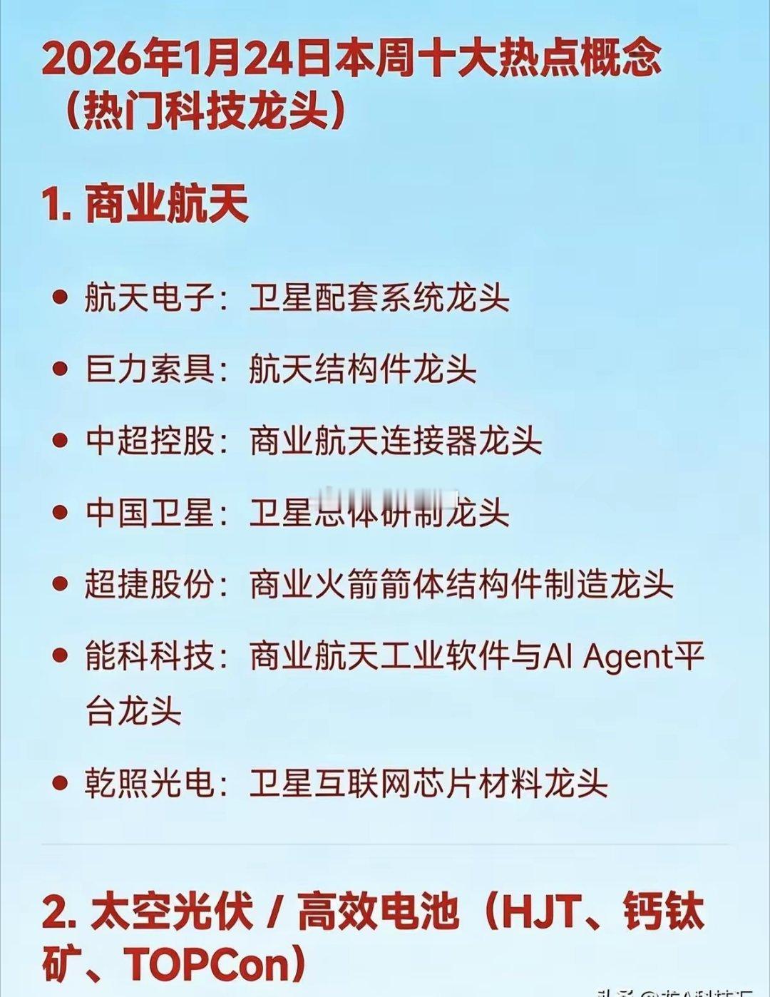 2026年1月24日,本周十大热点概念(热门科技龙头)。大伙儿都以为这些热门赛道是各跑各的,其实里头门道多着呢。最有趣的反而不是谁跑得最快,而是谁在给谁“递东西”。你看商业航天,巨力索具、超捷股份这些,吭哧吭哧地造火箭上的结构件。说白了,他们是那个在前面修路、搭台子的人。路修到天上去,成本降下来,后面的人才能上来唱戏。谁是唱戏的?太空光伏就是其中一出大戏。钧达股份琢磨着怎么在天上铺太阳能板,给卫星供电。他们的工程师,办公桌上除了图纸,可能还贴着一张商业火箭的发射排期表,时不时就拿指关节敲敲,心里惦记着那路啥时候能通。路不通,他这“太空发电站”的瓦片,一片也送不上去。这事儿说白了,就像一个村里要发展。你不能只指望一家养猪暴富,得有人先把路修到村口,有人把电网拉进来,然后张三的养猪场、李四的豆腐坊才能开起来。航天是修路的,光伏、卫星是开店的,AI和半导体就是给这村子装上智能管理系统的。能科科技的AI,帮着设计更聪明的火箭;乾照光电的芯片,让天上的卫星不犯迷糊。大家都在一个锅里吃饭,只是分工不同。谁也别觉得自个儿独一无二,你的成功,离不开旁边那个给你递扳手、拧螺丝的兄弟。所以看这份名单,感觉不像在看一堆冷冰冰的公司。它更像一张热气腾腾的施工蓝图,上面画的,是咱们下一代人头顶上那片天的样子。打卡AI芯片火箭卫星智能体