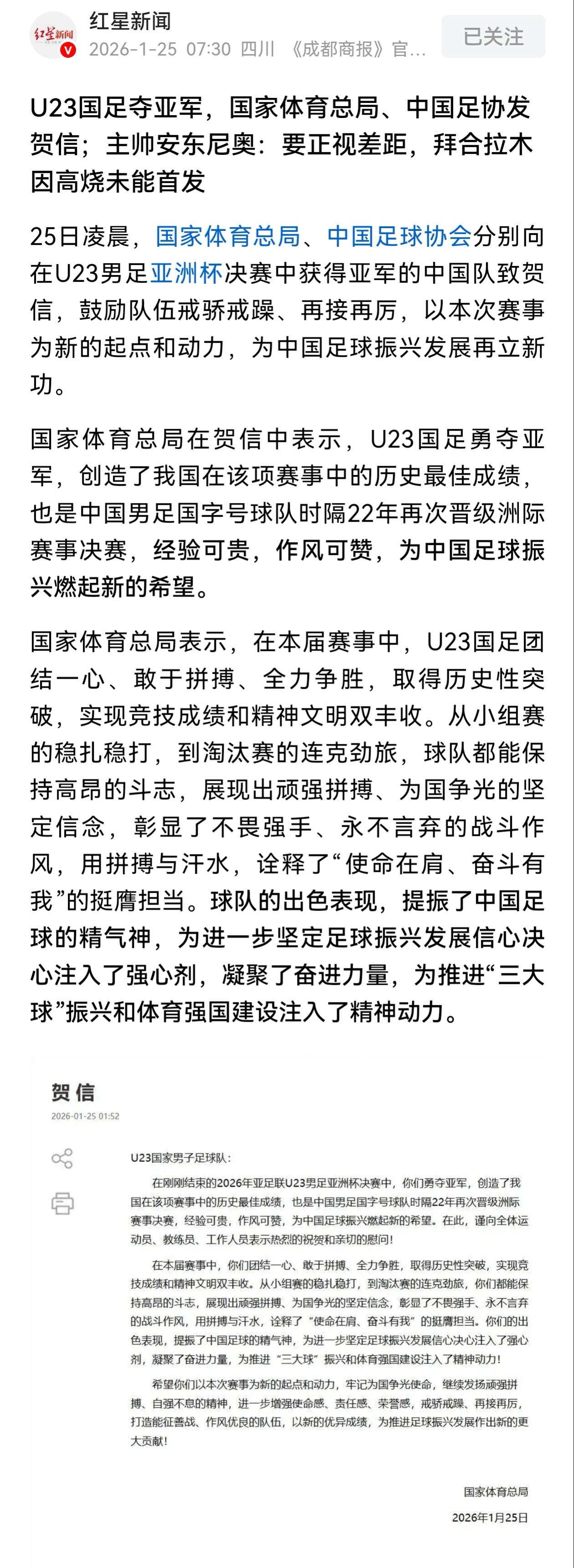 国家体育总局上一次给国字号男足发贺信是22年前:2004年成年队亚洲杯亚军,U17亚少赛冠军。22年了!终于看到了希望,“经验可贵,作风可赞,为中国足球振兴燃起新的希望。” 足球是世界第一运动,相当复杂和困难的一件事。比赛就像一场战斗,实力、运气、心态、阵型、战术,方方面面都影响结果。取舍间没有完美都会有遗憾。最可贵的经验是什么?做好防守,5后卫是对的。打亚洲一流强队,541才是更稳妥的防守。541看似不思进取的阵型其实才是实事求是,希望邵佳一能有勇气使用它。我说股市不是赌场不是游乐场而是战场。而真正的股神告诉你的不是进攻永远是防守,是护城河、是能力圈、是在低谷的坚持,是控制风险的纪律。中国男足理解5后卫用了22年,中国股民理解能力圈不会少于22年。足球和股市都很难,都需要认真对待,日积月累。