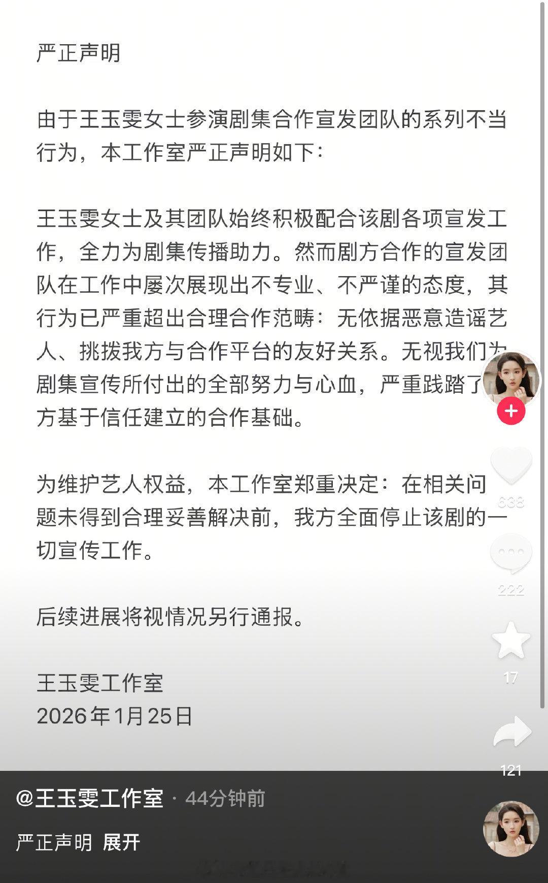 宣发团队里的工作人员说🫘的宣传是王玉雯自己的主意,vb去问责,因为潜规则是剧宣期间一天不能发超过三条🫘,超过了要按1:3补回来。然后工作室出来否认,说只是配合剧组的要求,表示不道歉的话艺人会停止新剧宣传,最后剧方出来道歉,说把那个工作人员开除了王玉雯方停止突然的喜欢一切宣传工作 王玉雯工作室全平台严正声明 造谣王玉雯涉事人员已被开除
