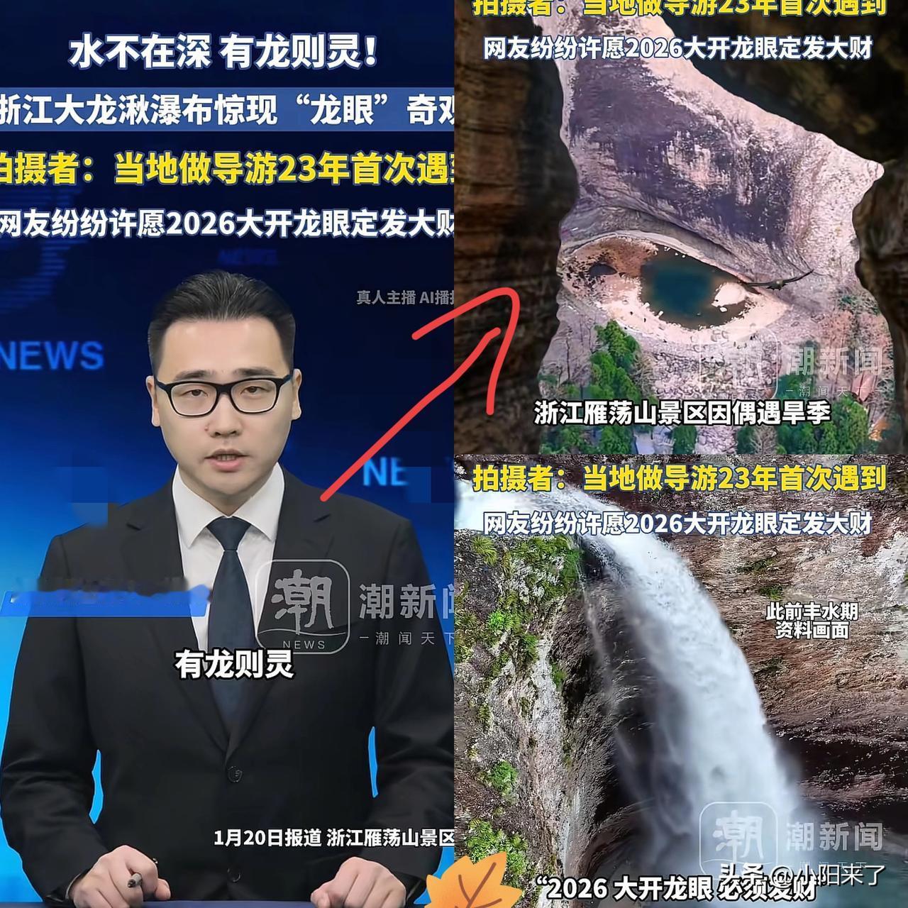 雁荡山干了23年的女导游,走到大龙湫瀑布底随手一瞥,当场定在原地!游客还在嬉笑拍照,没人发现往日碧波满潭的大龙湫,竟退水见了底,而潭心赫然卧着一只巨型“眼睛”,正静静望向天空。 她默默掏出无人机航拍,画面传出来的瞬间,周遭彻底鸦雀无声——浅色岩壁圈出温润眼白,潭心一汪深绿水洼成了灵动瞳孔,岩壁天然褶皱更是巧成一道深邃双眼皮,这浑然天成的“龙眼”,让守着雁荡山23年的老导游,都突然觉得这座山无比陌生。 这哪是什么偶然的奇景,分明是大自然藏在雁荡山的亿年浪漫,枯水期不过是帮我们掀开了这层神秘面纱。老辈的恶龙传说,网友的刷屏许愿,说到底都是人们对这份自然之美的偏爱与解读! 短暂的盛景才更显珍贵,这是大山独有的温柔馈赠,只留给恰逢其会的有缘人! 这哪是什么景点,这分明是老天爷借着干旱,给山底下那个东西一个睁眼的机会!