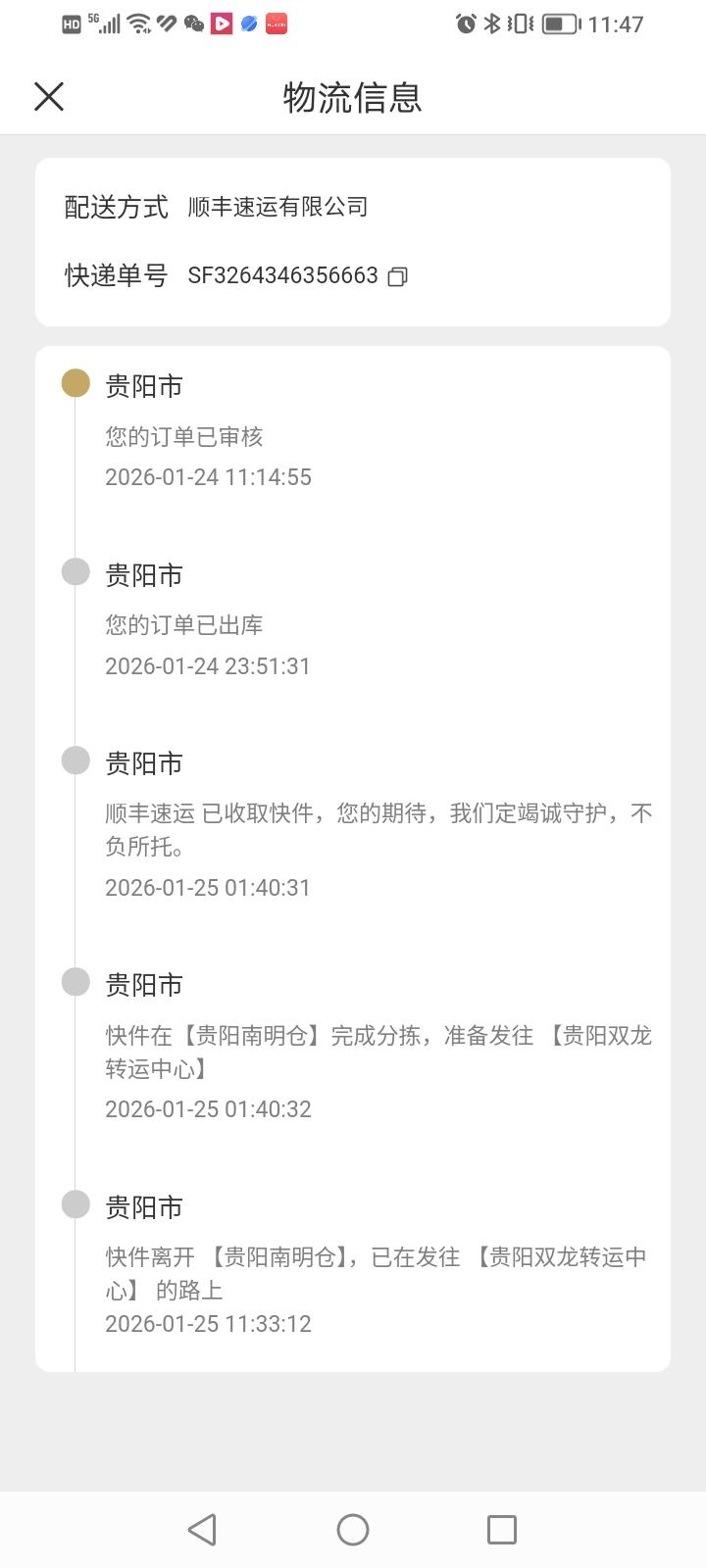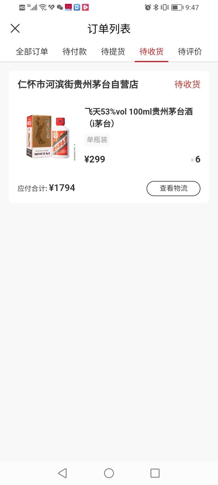 没想到昨天在头条上一吐槽,今天咱的53vol×100ml飞天小茅台酒就处于发货状态了。 目前物流信息显示从昨天订单审核完成到今天打包发货及转运,已经走完4道流程了,估计再有两三天就会到货了。这个速度不算太慢。 年前就不凑热闹了,打算年后再抢点1499元的飞天普茅放着,听说酱香白酒就要喝陈年老酒,可以每年买几瓶,这样就可以总喝两三年前的老酒,不是更香吗?