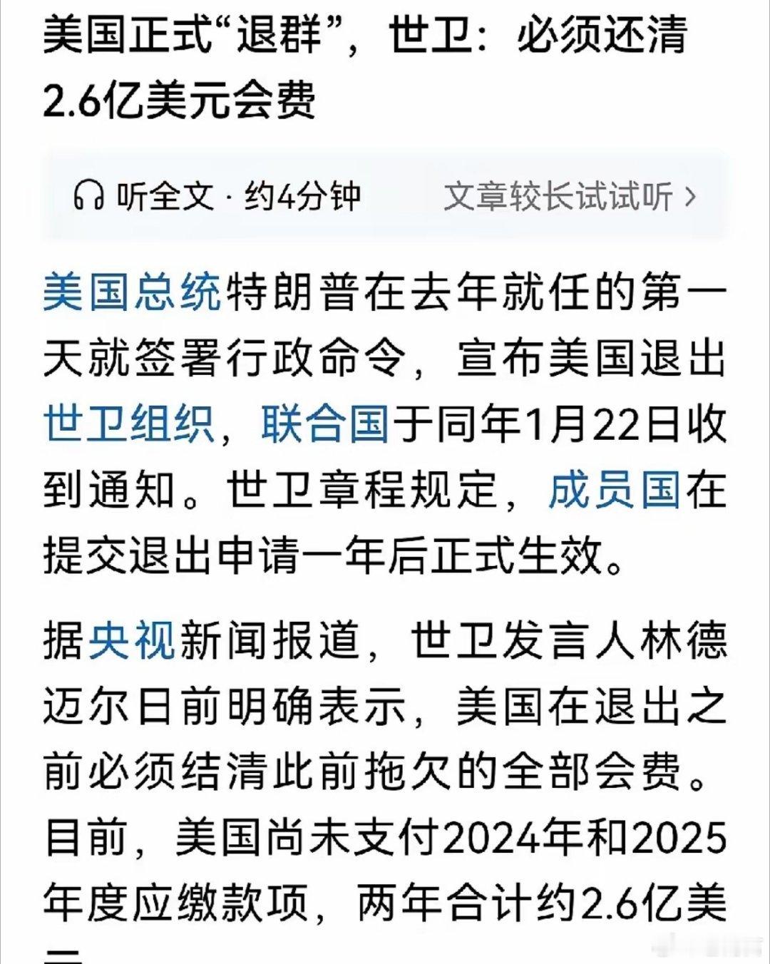 美国决定退出世卫组织的理由不实 按照世卫组织章程,退出要提前一年申请,如今一年期限到了,美国正式退出了。但美国还欠2024年和2025年的会费共约2.6亿美元,世卫组织还在要求其交清会费,但特朗普肯定是不交了,退出了他还交啥呢,你又没有强制手段。 世卫组织看来收的经费不少啊,光美国每年就1亿多美元,各国加起来交的钱肯定不是一个小数,东大也少不了。不知这组织平常做啥公益事业,平时真没有感觉到他的存在,能有助于解决“看病难、看病贵”吗?