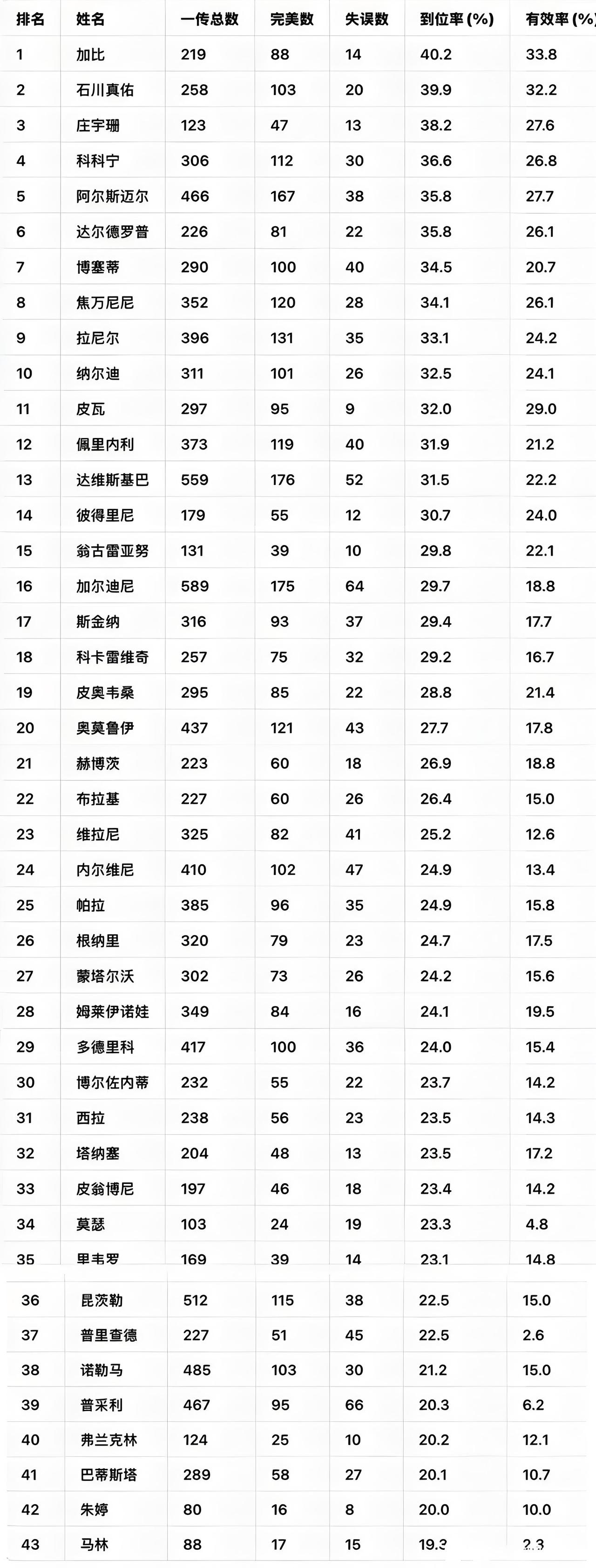 【朱婷意甲一传榜倒数第2】 这张图在中国女排吧很火~ 是意大利女排联赛主攻的一传统计榜 本来不想发会伤害某群体脆弱的心灵 被逼无奈展示一下~ 真相有时很刺眼~ 一共统计进去的43名主攻里面 号称198自由人的朱婷排名倒数第2 80个一传失误8个,到位率20%,效率10% 这还是两大地面高手 加比跟德吉纳罗保护的情况下~ 现在竞技状态下滑后一传属于自保都难 反观中途加盟的庄宇珊接了123个 到位率38.2%已经跻身前三名!