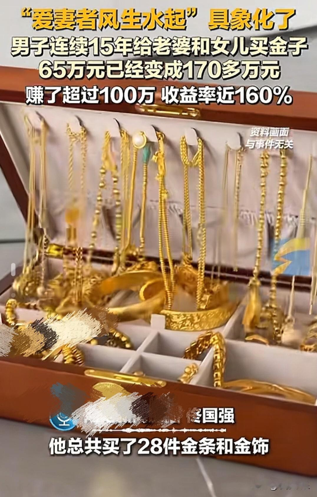 “日子怎么可能跟谁过都一样”!湖南一大哥,用15年 ,28件黄金,完美的诠释了这句话。 从2011年结婚买三金开始,以后每年,每逢结婚纪念日,金手链,金手镯等各种饰品换着花样嘛! 等女儿出世后,每年女儿的生日,大哥都给她买各种小首饰,买到现在已经28件了。价值超百万,买首饰只花了65万。小赚。 网友评论: “真真应了那句,爱妻者风生水起[流泪]” “怪不得人家说了,越有钱的人越有钱,一般人哪有那么多钱买金首饰[呲牙]” “已经把声音开到最大了,就是不知道老公听不听得到了” 这大哥也是实在,就一句话:“家庭和睦才是王道” 你对此有什么感悟?