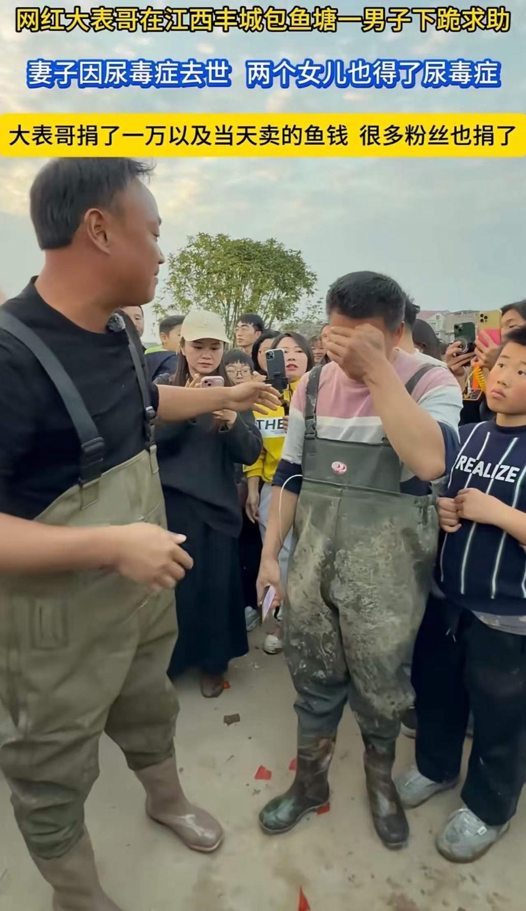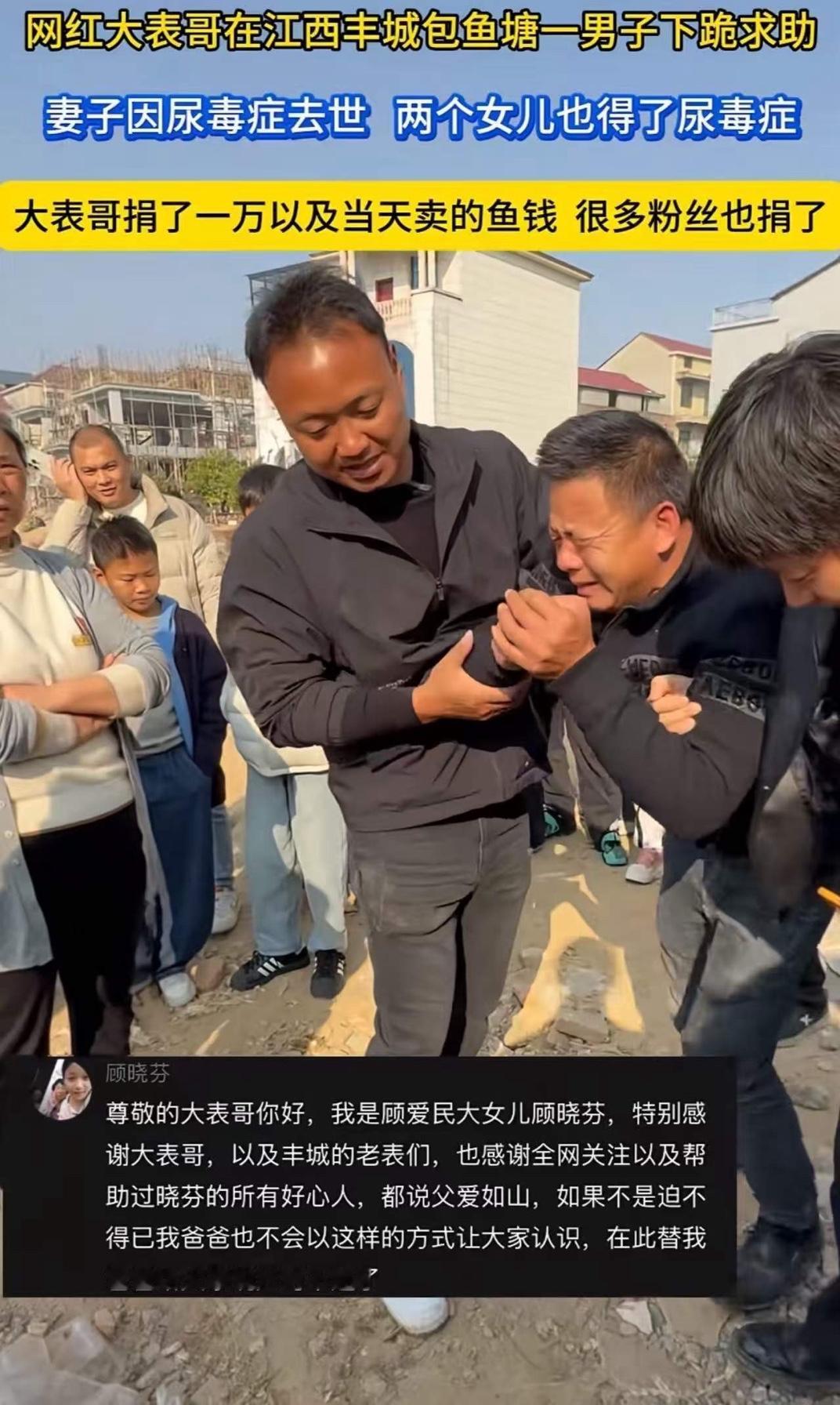 看哭了!老婆得了尿毒症,怕连累家庭自己喝农药走了,男子还没从悲伤中走出来,2个女儿又查出尿毒症晚期!他实在无力支付医药费,听到拥有千万粉丝的网红大表哥花10多万包下雷钟潭,跑过去就给大表哥跪下了……而大表哥的做法,令人怒赞! 泪目!妻子离世后双女又患绝症,父亲跪求网红大V引暖心救援 近日,江西某县一户普通农家接连遭遇命运重击,让无数网友揪心落泪。45岁的李建军(化名)在妻子因尿毒症自杀离世后,又面临两个女儿同时确诊尿毒症晚期的绝境,走投无路之际,他向拥有千万粉丝的网红"大表哥"下跪求助的场景,引发全网关注。 三年前,李建军的妻子确诊尿毒症后,为不拖累家庭选择偷偷喝农药自杀。妻子离世后,他独自抚养两个女儿,靠打零工和种地维持生计。然而命运并未放过这个家庭,今年年初,16岁的大女儿和14岁的小女儿相继出现浮肿、乏力症状,经检查均确诊为尿毒症晚期。面对每周数次的血液透析和数十万元的移植费用,这个年收入不足3万元的家庭彻底陷入绝境。 "孩子妈妈走的时候,我就发誓要守住这个家。"李建军哽咽着说,当他听说网红"大表哥"在雷钟潭景区举办活动时,抱着最后一线希望赶往现场。见到偶像的瞬间,这位硬汉突然跪倒在地:"求您救救我的孩子!"这一幕被现场观众拍下后迅速传遍网络。 令人感动的是,"大表哥"当即决定暂停活动,现场发起募捐并个人也捐款,他含泪表示:"这个家已经失去母亲,不能再失去孩子。"随后,其团队联合多家医院开通绿色通道,承诺承担两个女孩后续治疗费用。更令人暖心的是,数万网友通过直播平台接力捐款,短短三天筹集善款超80万元。 目前,姐妹俩已开始接受系统治疗,社会各界的关爱仍在持续汇聚。这起事件不仅展现了网络时代的温情力量,更引发公众对农村医疗保障体系的深度思考。正如网友评论:"当个人命运与时代善意相遇,再黑暗的隧道也能看见光。"看哭了 妻子离世,俩女儿又是尿毒症晚期 父亲跪求网红