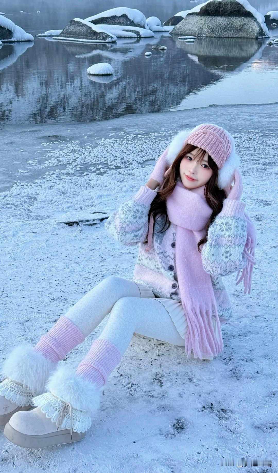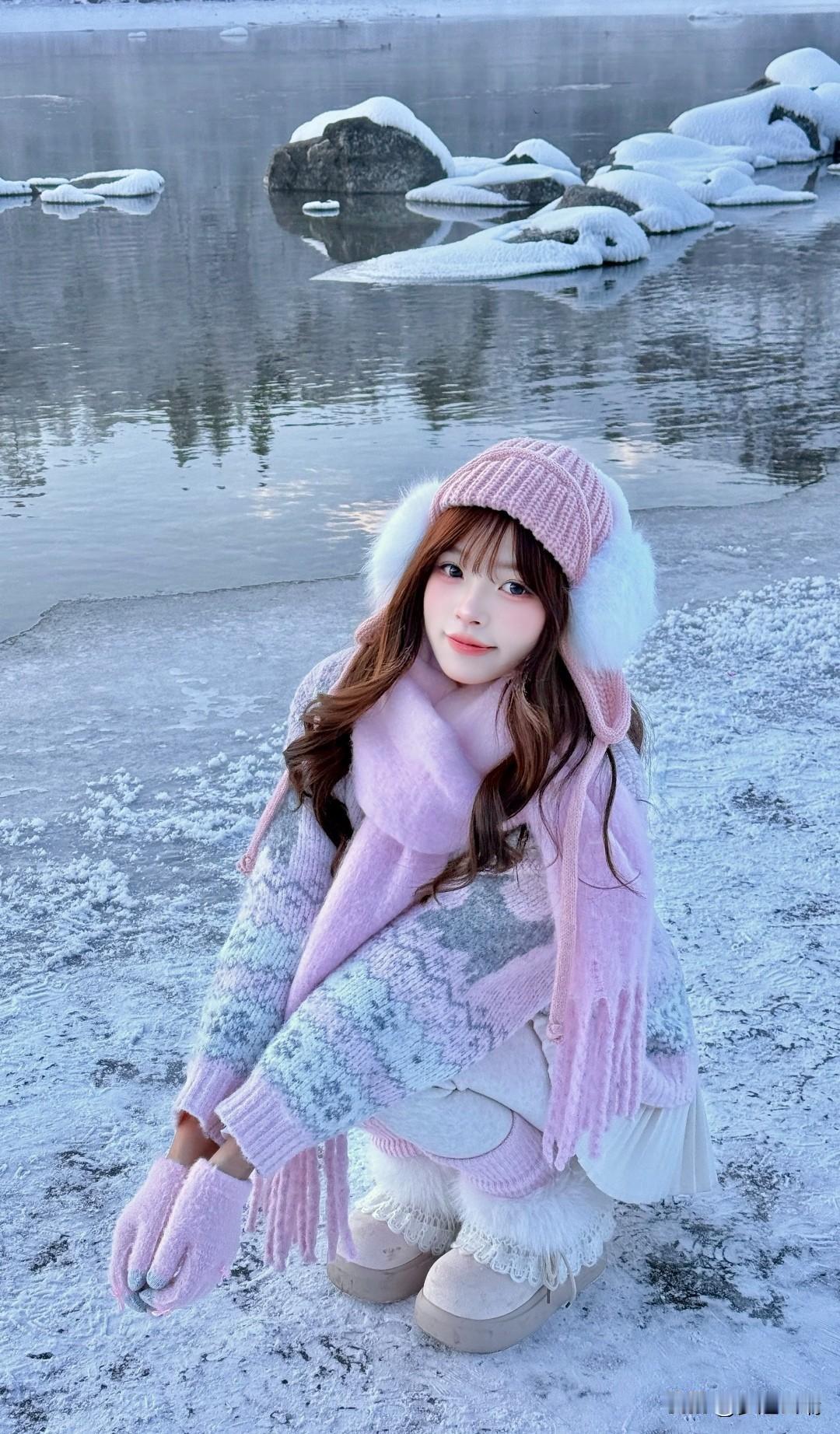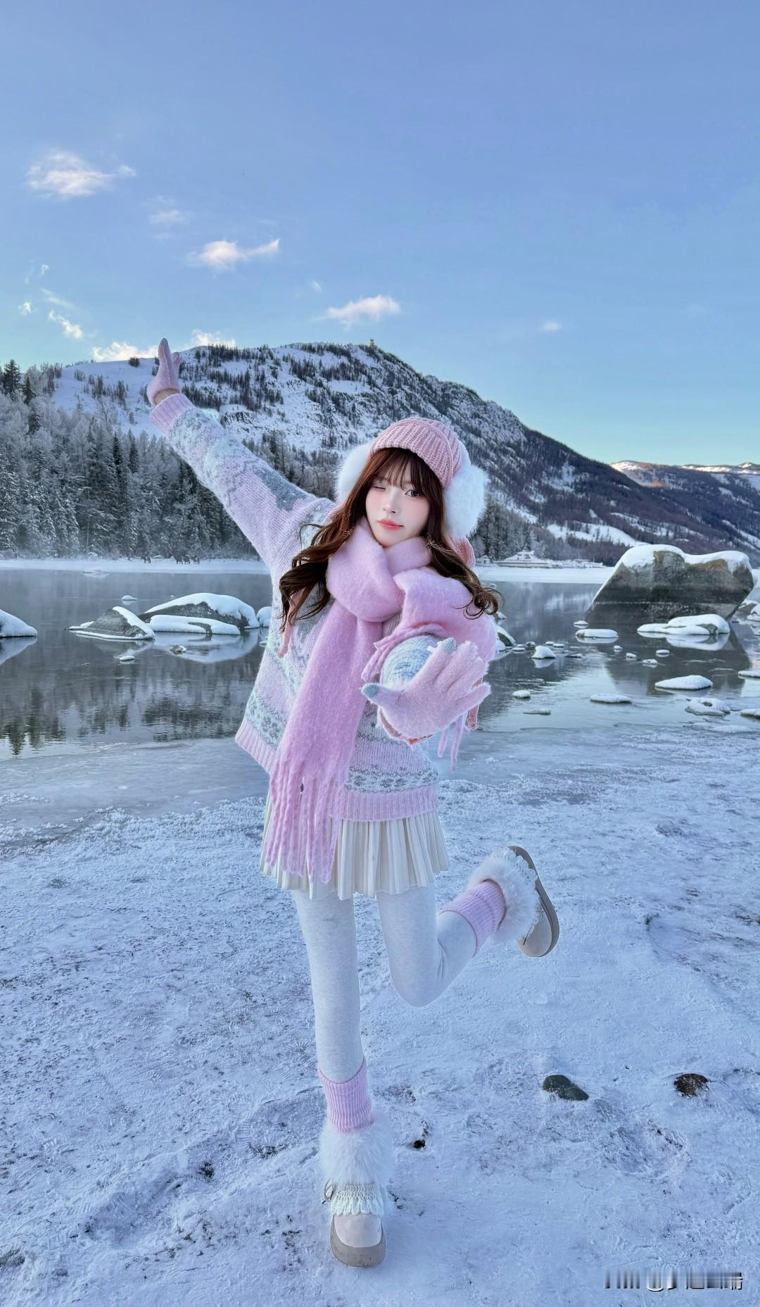 冬日暖阳下的雪景,甜美少女在湖边欢笑。