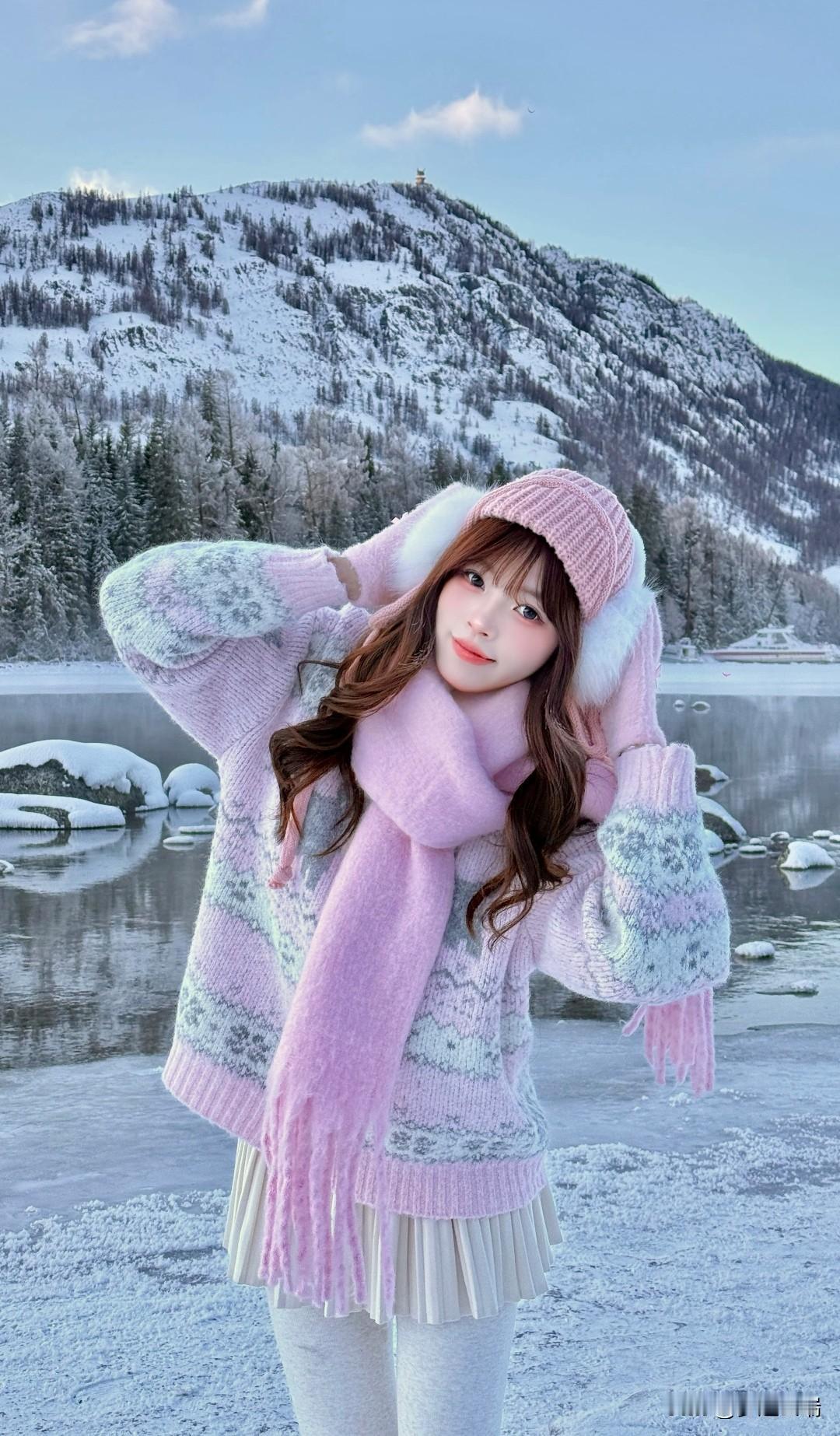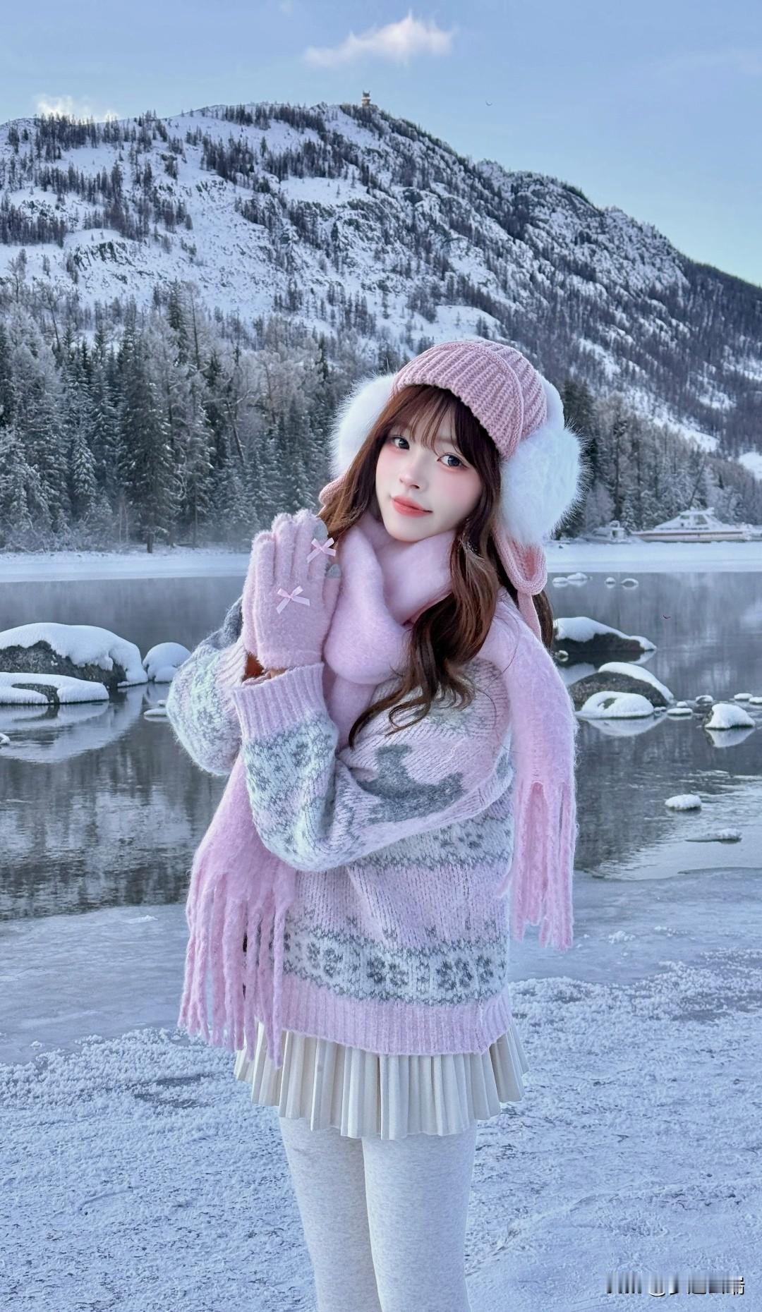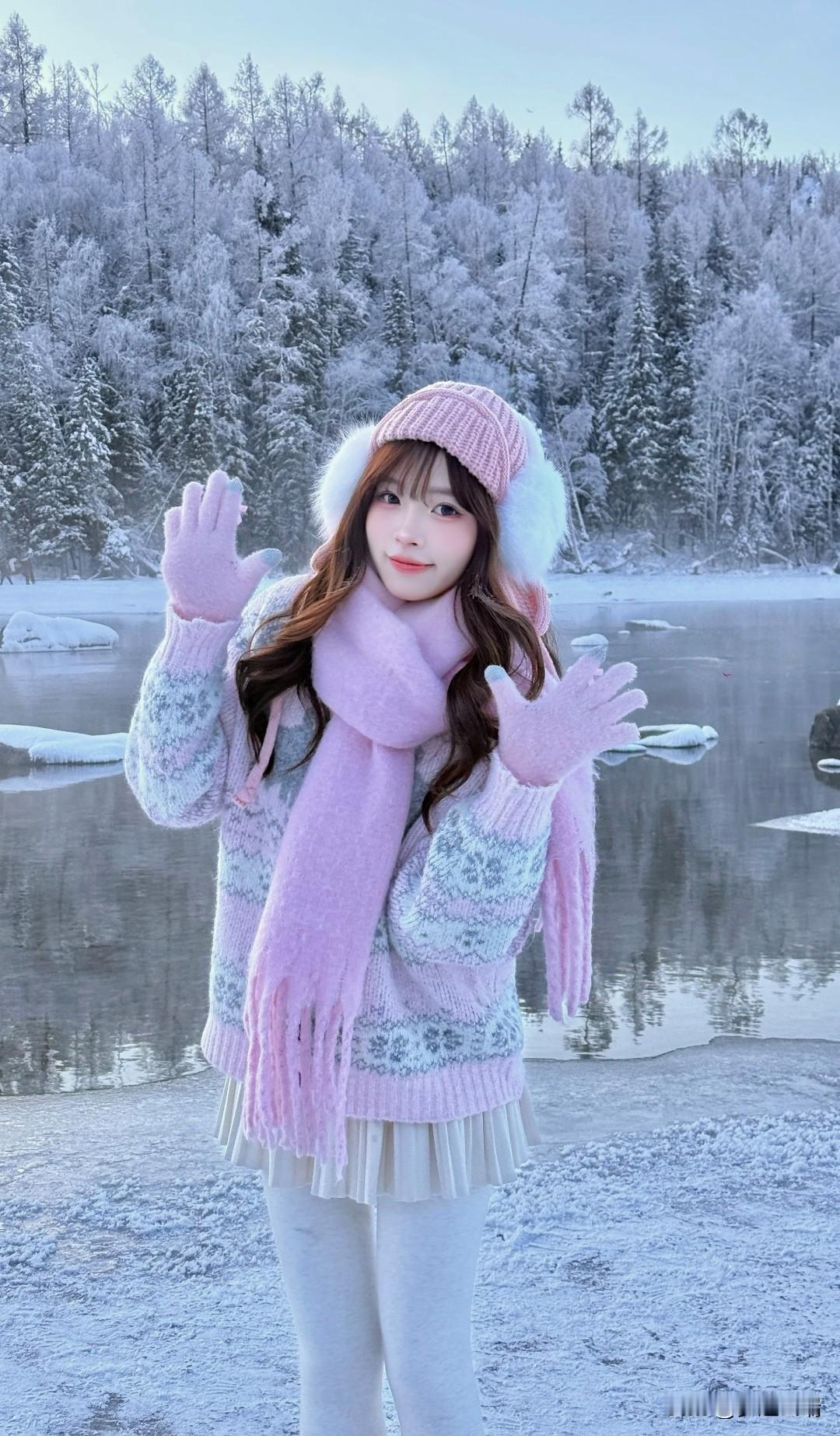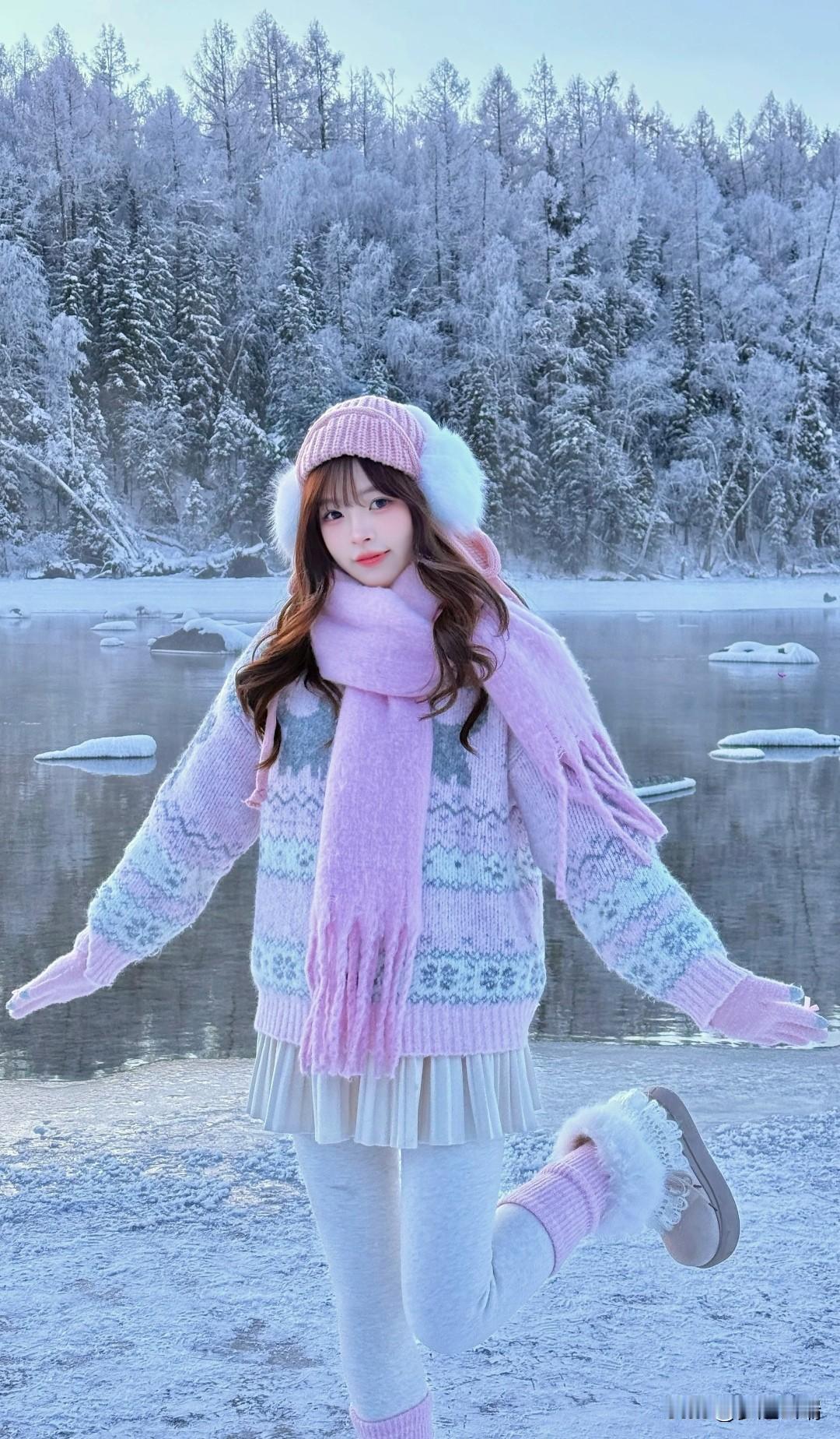 冬日暖阳下的雪景,甜美少女在湖边欢笑。