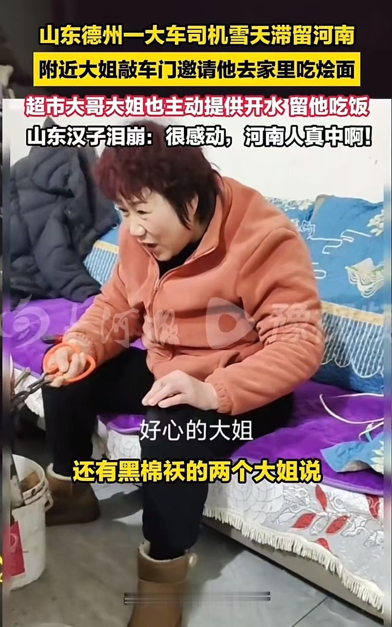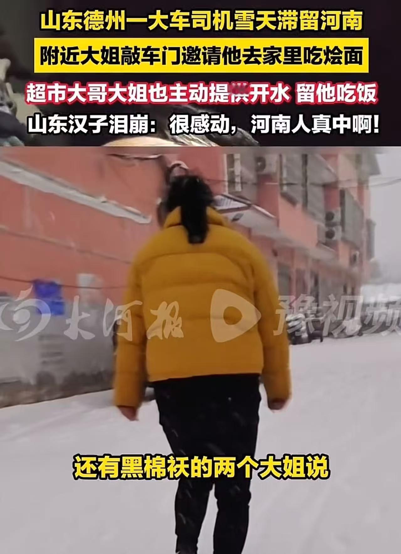 山东货车司机大哥因大雪被困河南多日,被当地人“整哭”了!大哥直呼:河南人真中!原来,当地人纷纷请大哥到家里吃饭,大哥2天被投喂4顿,感动的眼泪直流,为了回报恩情,大哥也干了一件“大事”!网友:双向奔赴的美好,让这个冬天不再寒冷! 河南突遭暴雪,高速封道,这位来自山东的货车司机王大哥只能把车停在路边,想再启动的时候,车子就打不着火了。 王大哥没办法,只能等雪停了再走,饿了就吃车上的干粮或者泡面! 1月19日下午。王大哥正蜷在驾驶室里打盹,突然有人轻轻敲窗。 他一睁眼,看见两位裹着厚棉袄的大姐站在车外。 “师傅,我看你在这儿停了一天多了,是不是没吃饭?去俺家吃口热乎的吧!”其中一位大姐笑着喊。 王大哥连连摆手:“不用不用,太麻烦你们了……” 可大姐一眼看穿他的窘迫:“别客气!我家男人也是跑大车的,我知道这行多不容易——风里来雨里去,一顿热饭都难吃上。你等着,我回去给你端碗烩面!” 不到二十分钟,一碗热气腾腾、汤浓肉香的羊肉烩面就递到了王大哥手上。 面条筋道,羊肉软烂,汤里还飘着香菜和辣椒油——那是他几天来第一口真正意义上的“饭”。 更暖心的是,大姐临走前说:“这几天雪不停,你就别硬扛了,饭点直接来我家,管够!” 王大哥实在过意不去,跑去附近小超市想买点东西当谢礼。 老板一听他是被困的货车司机,立马邀请:“我给你烧壶开水,晚上再炒俩菜,你来我这一起吃!” 短短两天,王大哥被四户人家轮番“投喂”!这个在高速路上跑了八九年、见过无数冷脸的汉子,终于绷不住了! 王大哥说:“我跑车这么多年,从没想过,会在一个陌生地方,被这么多人惦记着。河南人,真中!” 为了回报这份恩情,王大哥第二天天没亮就起床,拿着铁锹,把几位好心人家门口的积雪一寸一寸铲得干干净净。 “我没什么能报答的,只能帮他们扫扫雪,让老人孩子出门安全点。” 此事传开后,网友纷纷留言: “这才是中国人的温度!不是口号,是实实在在的一碗面、一句‘来我家吃’。” “高速封路封得住车,封不住人心。河南老乡,格局拉满!” “有些地方对外地人防贼一样,而河南人把陌生人当亲人——这就是‘中’的底气!” “双向奔赴的善意,这个冬天,因为这样的故事,不再寒冷。” 当地村民没问王大哥是哪里人,他们只看到:一个冻得发抖的人,需要一口热饭。 真正的文明,不在高楼大厦,而在街坊邻里的一句“来家吃饭”; 真正的善意,不靠政府动员,而源于普通人骨子里的共情与慷慨。 王大哥扫的不只是雪,更是人与人之间的隔阂;河南老乡给的不只是饭,而是对“劳动者尊严”的无声守护。 一座城市的温度,不看它有多少网红打卡点,而看它是否愿意为一个被困的陌生人,点亮一盏灯,端上一碗面。 这样的河南,值得一句——真中!