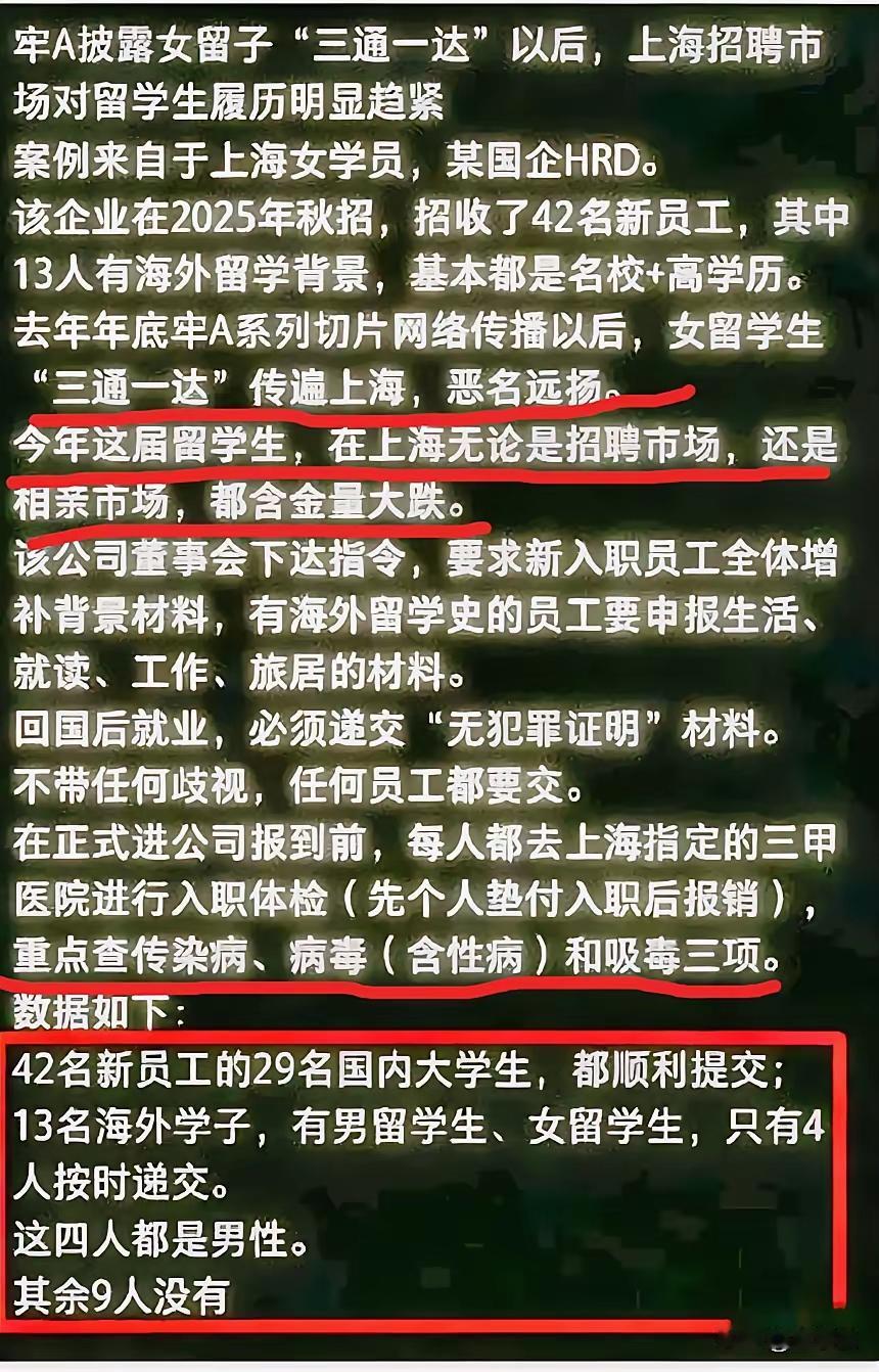 属于留学生的时代真的过去了,去年董明珠说不录用留学生,今年牢a直接把留学生锤到地底,已经有大家族立下族训,不娶留学女,不让女孩出国留学,执意不听者,族内除名。这还真不是大家草木皆兵杯弓蛇影,而是太多活生生的例子惊掉大家的下巴,比如上海某公司就发生13名留学生没有一名女留学生按时提交体检报告,这简直细思极恐。 更恐怖的是那些有国外生活经历的名人集体沉默,他们的沉默可以说振聋发聩。