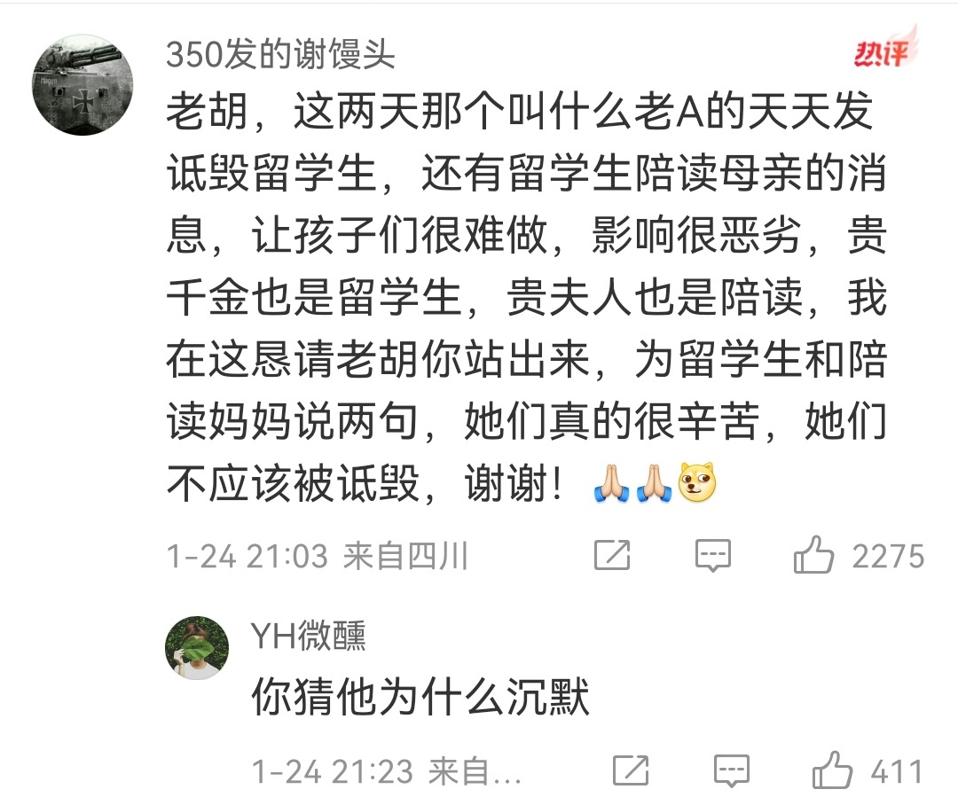 胡锡进网友虾仁猪心,老胡的沉默震耳欲聋。