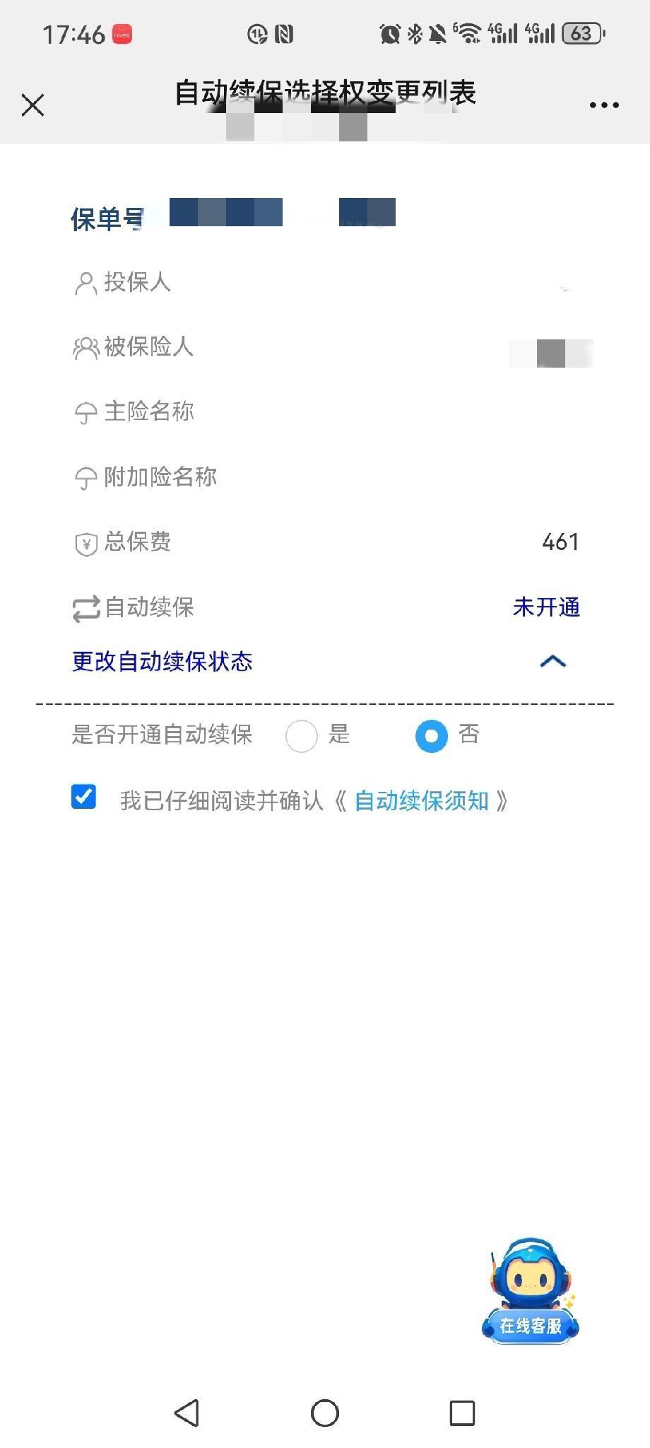 保险续保选自动扣款真得注意。 今天银行公众号突然接到一条信息,说我农行某医疗保险扣款671元失败。 不对啊,之前都是400多元一年,怎么突然间就多了200多呢。 去翻了保险合同条款,也没找到匹配的说法。 只找到这么一条,自保险人首次投保本合同的生效日起,每6年为一个保证续保期间。 在今天扣款之前也没接到该保险公司电话,或者短信通知。 刚才果断去公众号认证取消了自动扣款。 现在很多人嫌麻烦,弄了各种自动扣款。虽然省心了,但是说不定什么时候就会在不知情的情况下损失一笔自己辛辛苦苦挣得辛苦钱。 商业险续保