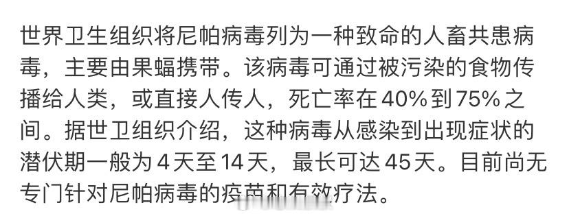 多国加强监测应对印度疫情wc…!!印度西孟加拉邦2026年1月暴发的尼帕病毒疫情(致死率40%-75%,潜伏期最长45天)而且目前因无疫苗且跨境传播风险高,已引发泰国、尼泊尔等多国紧急升级边境监测。 据说这是一种致命的人畜共患病毒,可以通过被污染的食物传播,甚至可以直接人传人。能不能不要那么离谱,阿三的世界真的越来越可怕 广州