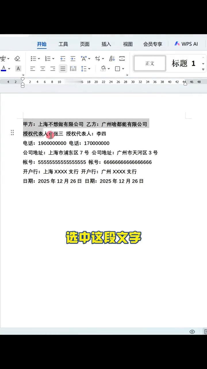 乙方信息往右对齐。 让你把乙方信息全部往后移对齐,你不会一个一个敲空格敲到下班吧?高手5秒就好。 ·只要选中这段文字,用鼠标点一下标尺26的位置,添加一个制表位。 ·然后把光标放在乙方前面,按Tab键就能把所有文字对齐在26的位置。 ·如果冒号前面的文字也想对齐,先选中第一个文字,按住CTRL键不松手,再逐一选中下面的文字。 ·然后找到中文版式图标,选择调整宽度,新文字宽度输入5,因为这里文字最多的是5个字,然后确定就好了。 你学会了吗?