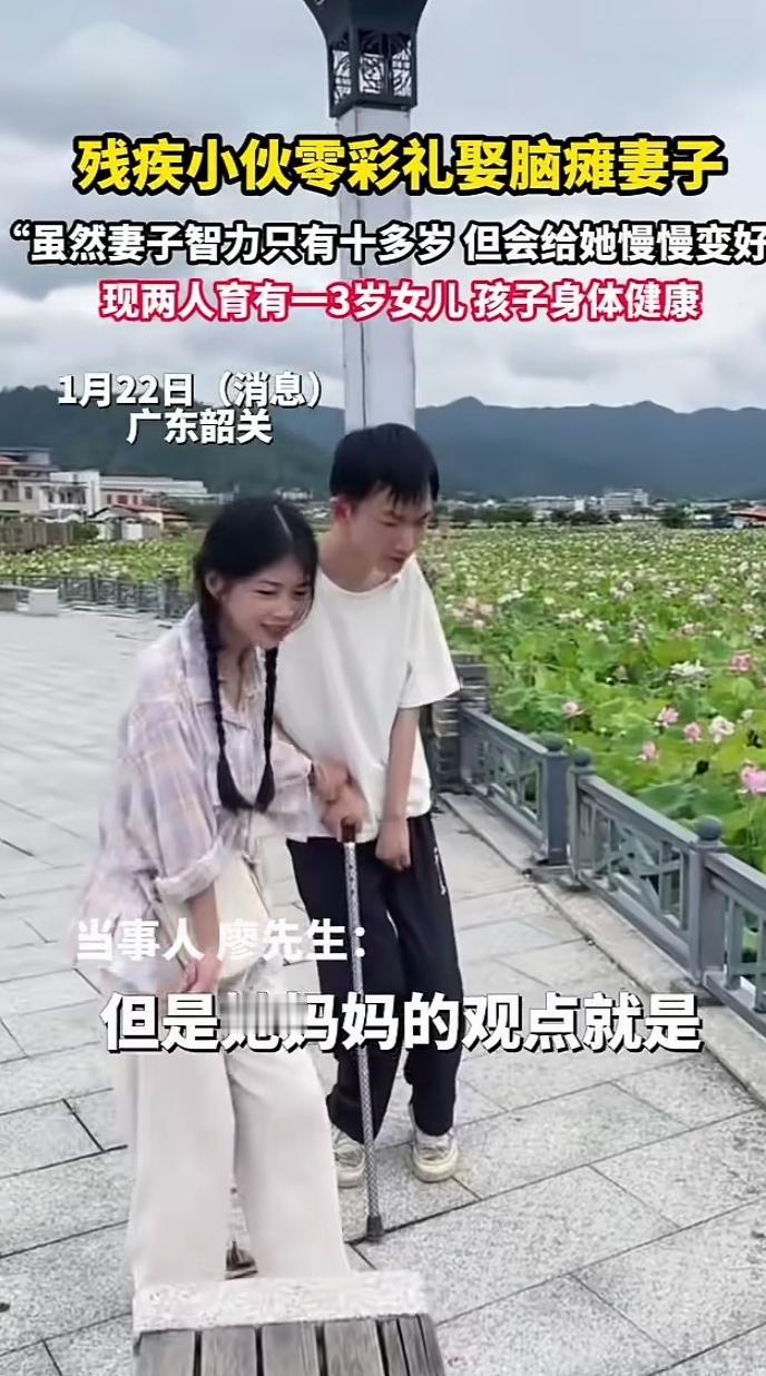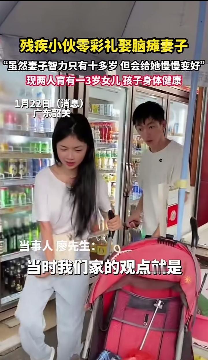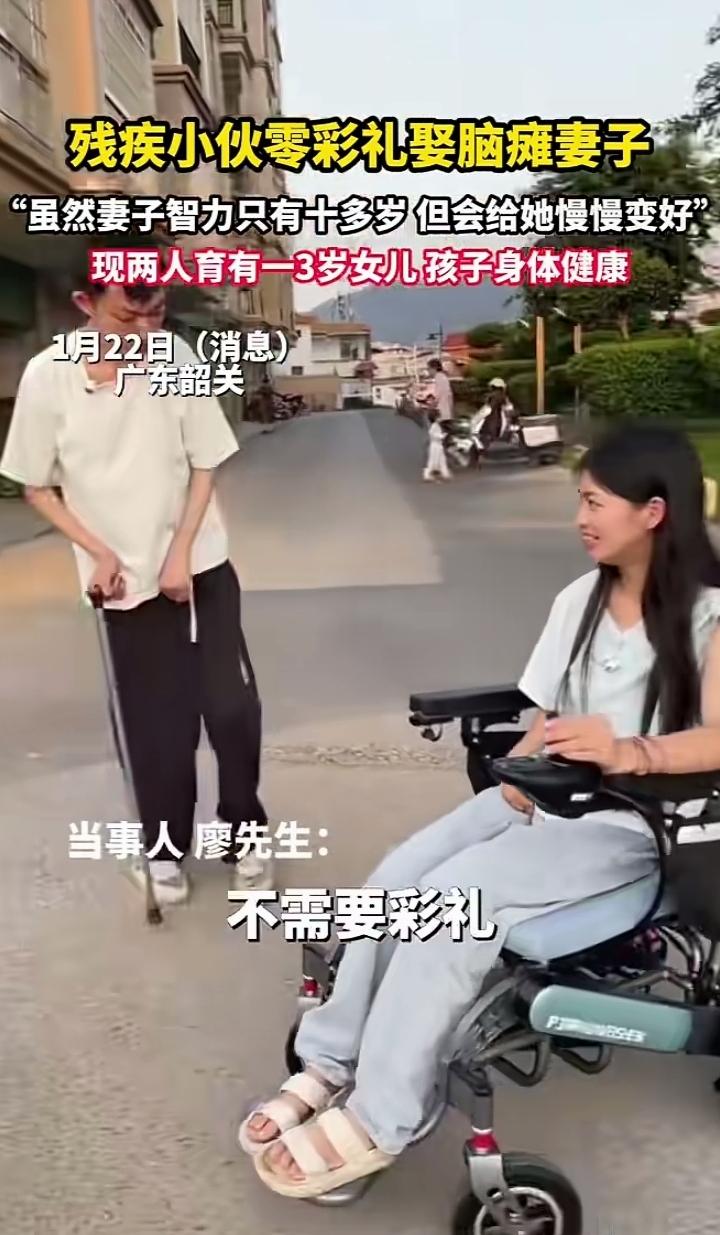零彩礼娶脑瘫妻子,智力只有十多岁,余生只为护她周全 广东韶关,残疾小伙廖先生用行动告诉我们:真正的爱,从来不是权衡利弊,而是我懂你的难,也愿意陪你慢慢变好。 他没有因为妻子脑瘫、智力仅相当于十几岁孩子而退缩,更没让世俗的彩礼成为阻碍,2021年就用一场简单的酒席,给了她一个家。如今,他们的女儿已经3岁,健康又可爱。 有人说这是“扶贫式婚姻”,可在廖先生眼里,妻子只是需要被照顾的小孩;在妻子眼里,他是能依靠的全世界。 没有轰轰烈烈的誓言,只有“我会陪你慢慢变好”的温柔。 这大概就是爱情最好的模样:不看条件,只看真心;不问过往,只盼余生。 愿我们都能在这个功利的世界里,遇到那个愿意和你“慢慢变好”的人。 无彩礼的婚姻 社会百态