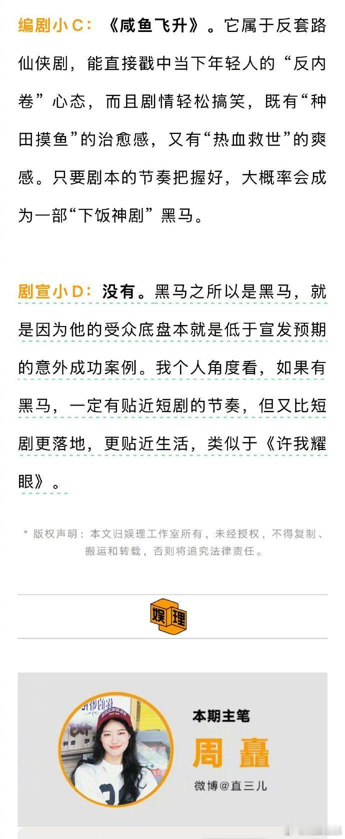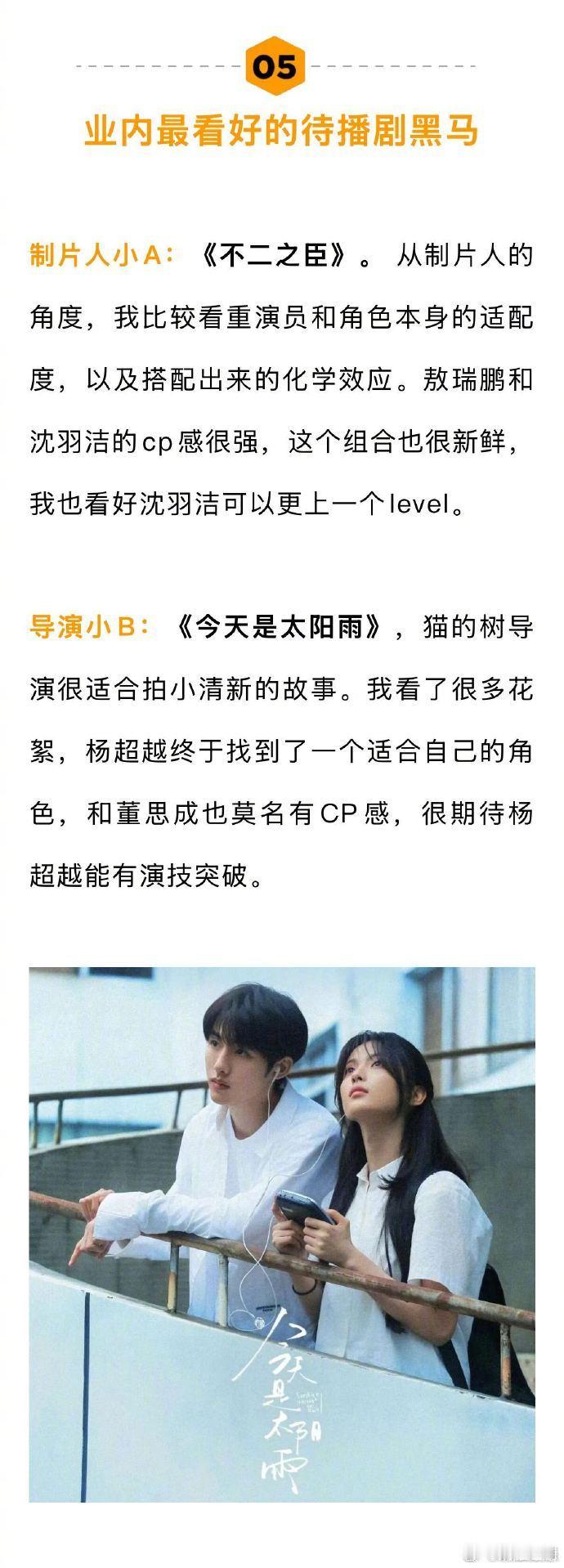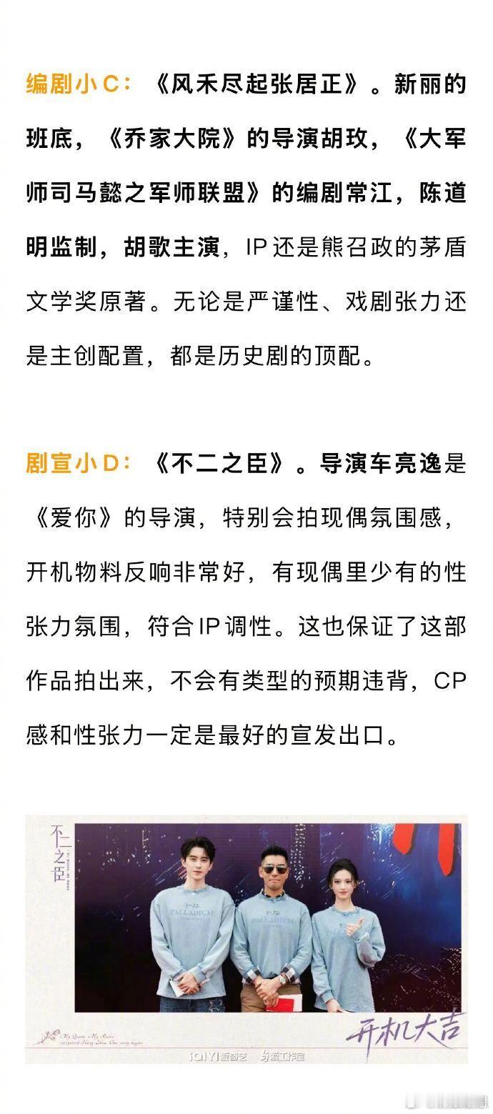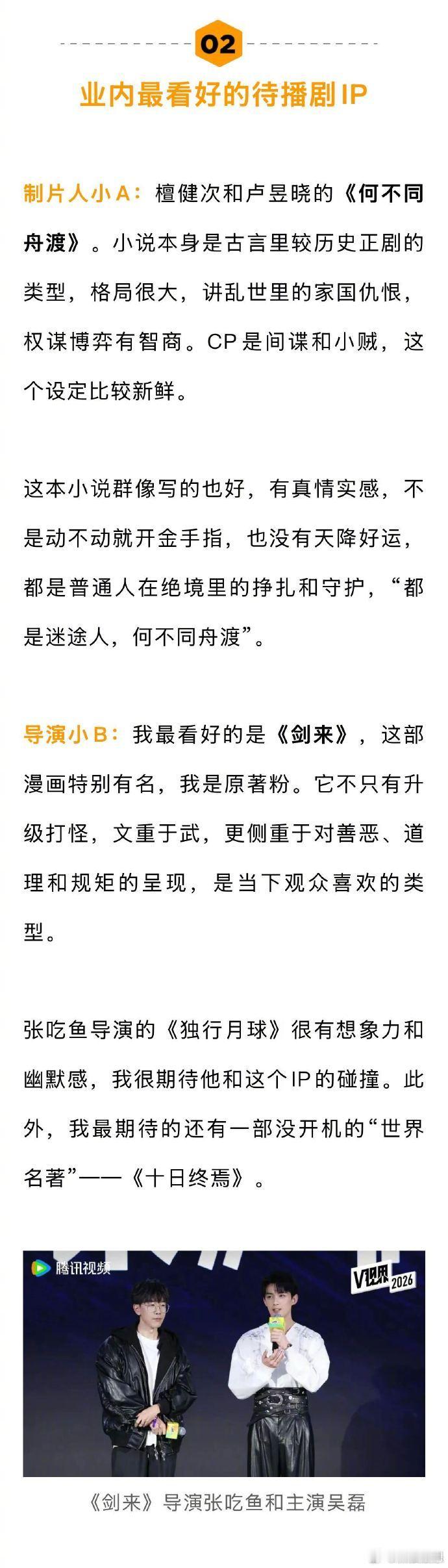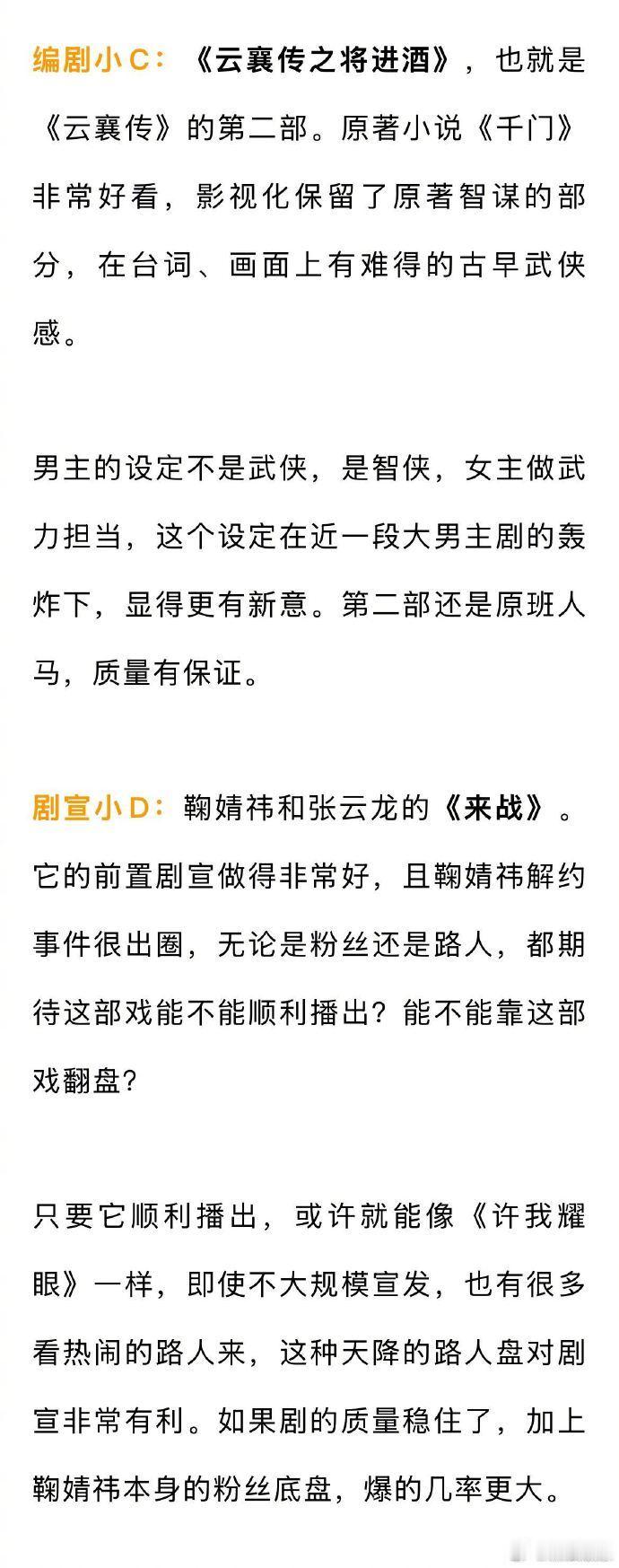2026年业内看好的待播剧,和你的预期是否一样?最看好的待播剧IP《何不同舟渡》《剑来》《来战》等;最看好的卡司有《谍报上不封顶》《生命树》《尚公主》《这一秒过火》等;最看好的主创有《咸鱼飞升》《逐玉》《风禾尽起张居正》等;最看好的黑马有《不二之臣》《今天是太阳雨》等。