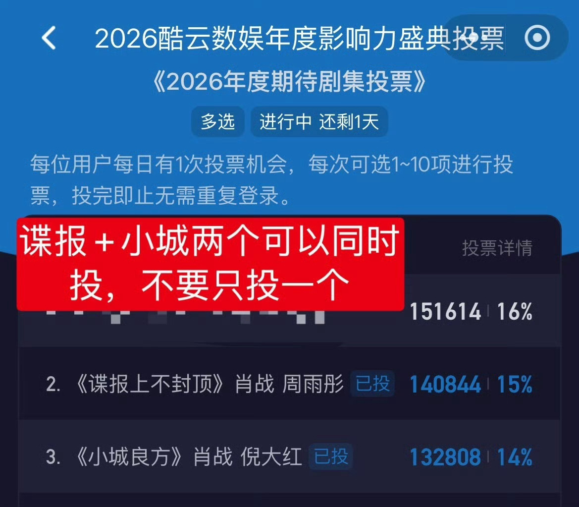 ❗❗全被超了!每天都可以投,明天截止,作品要选两个!拿家人手机投一下,前几天都是断层的,大家不知道每天可以投,被偷塔了1️⃣谍报➕小城良方,9号和35号这2个一起打✅投 小程序://酷云数娱/gShaBq5b2erO9Ry2️⃣人物投藏海(翻到底)小程序://酷云数娱/pnYkzjaUapstahv