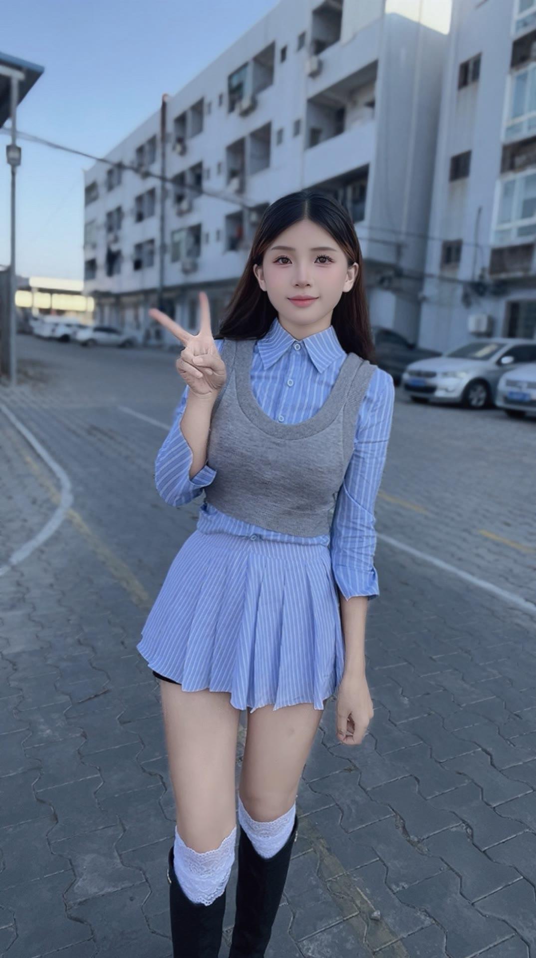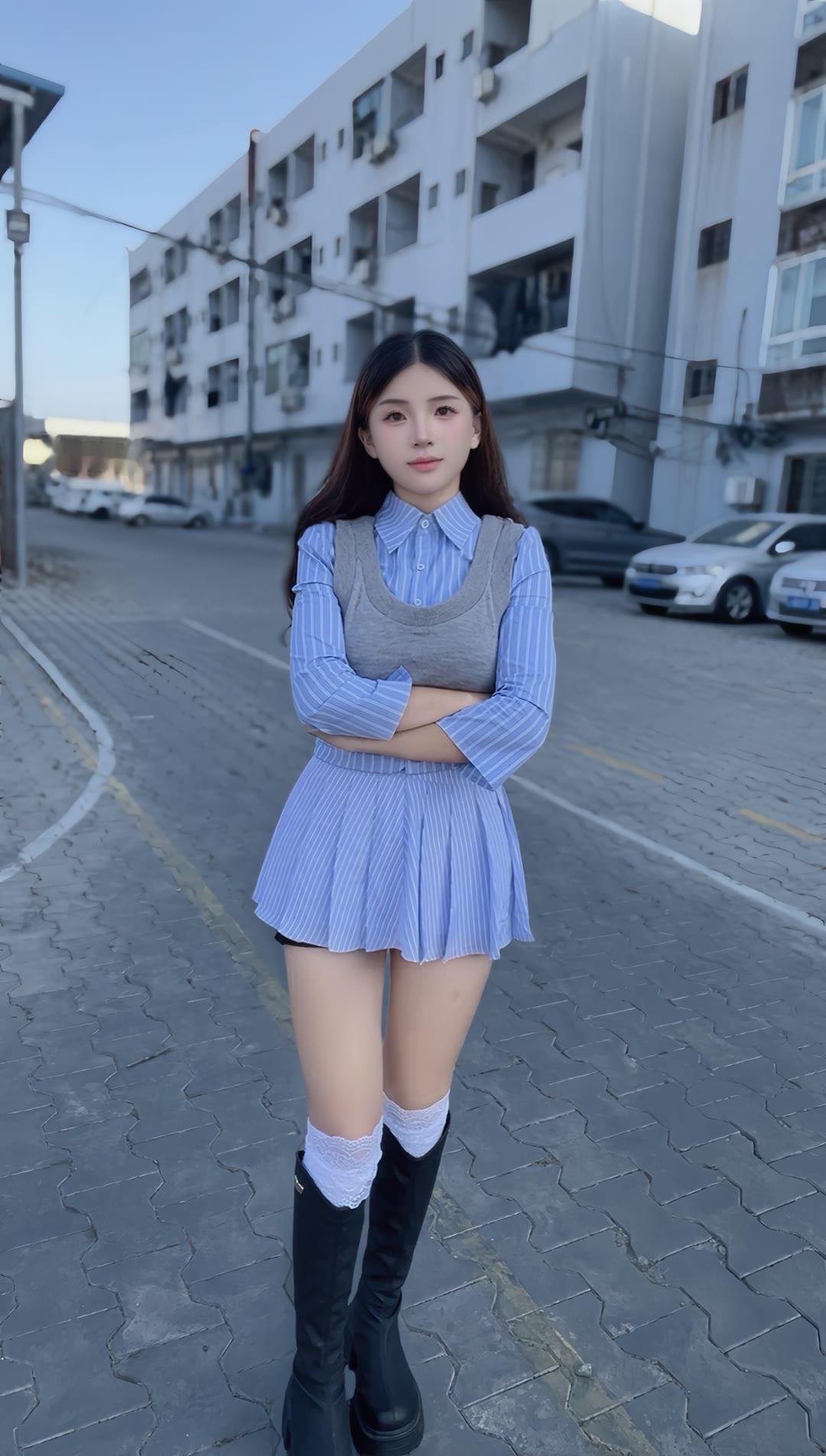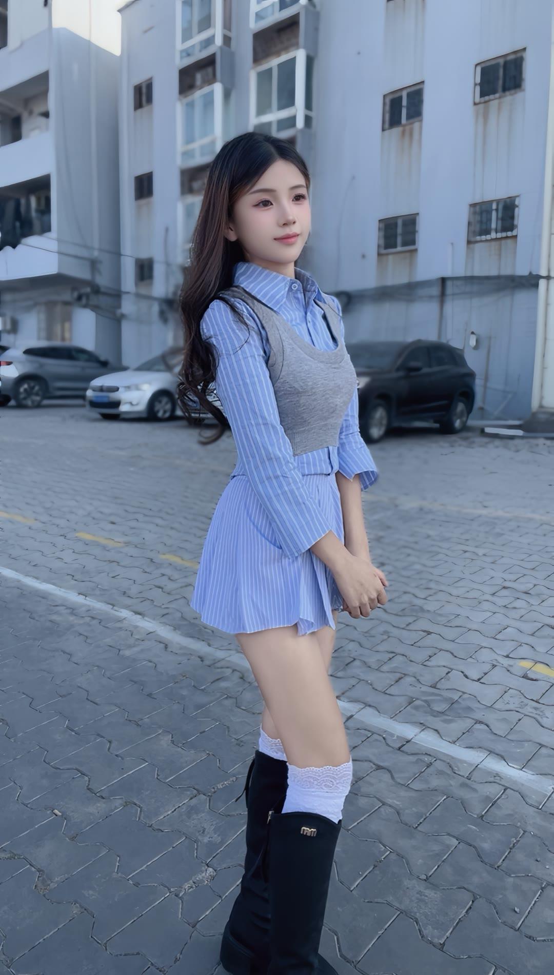 女人如何穿出含蓄的性感? 甜美少女风穿搭,蓝白条纹衬衫裙搭配黑色长靴,青春活力满满!💕👗👢