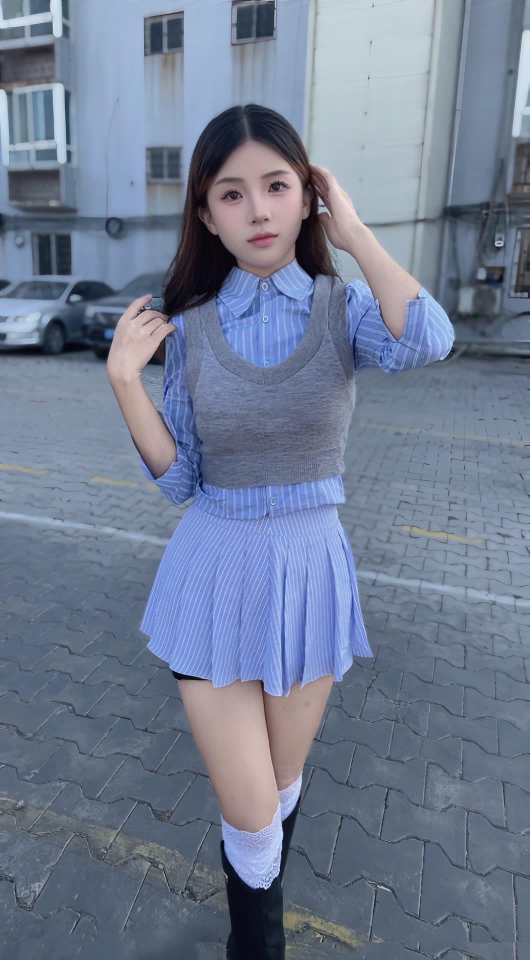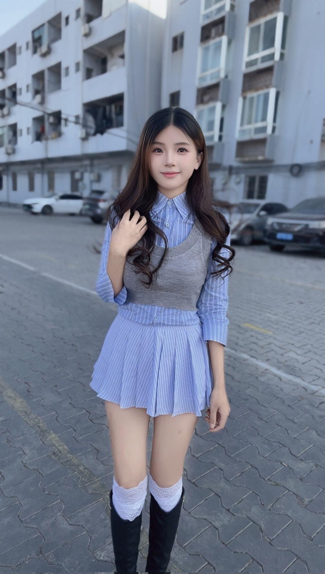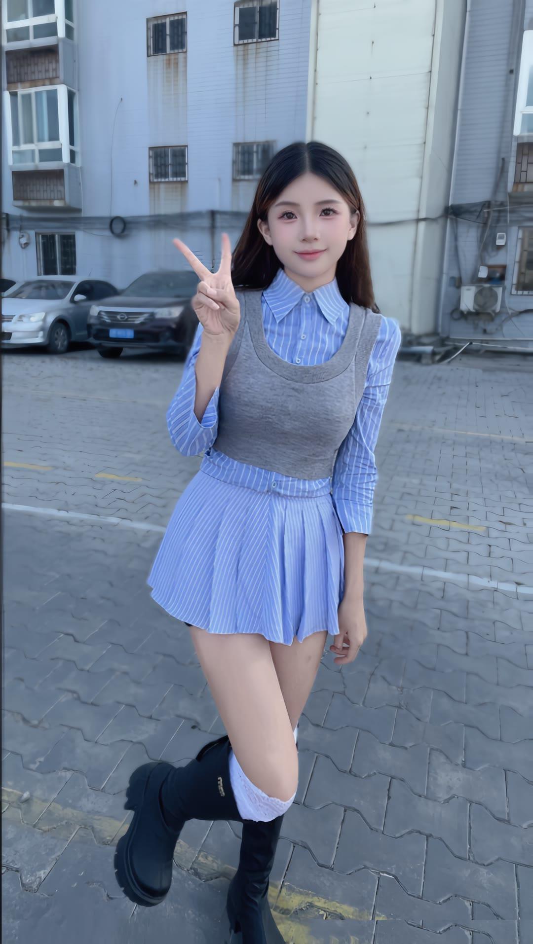 女人如何穿出含蓄的性感? 甜美少女风穿搭,蓝白条纹衬衫裙搭配黑色长靴,青春活力满满!💕👗👢