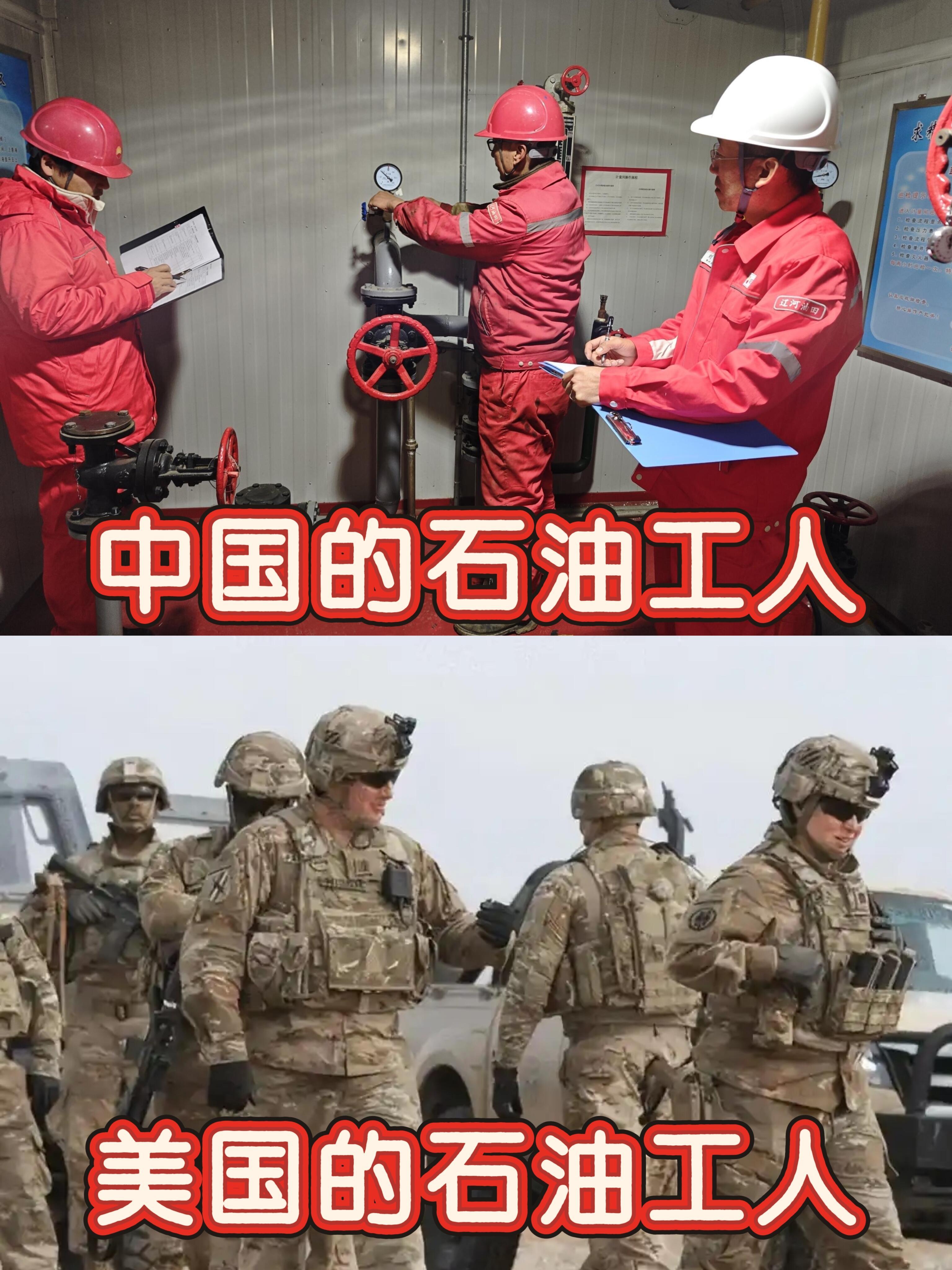 中美石油工人对比。美国的页岩油成本太高,极度废水,做出来主要是各种燃油跟副产品,还是抢别国石油比较划算。