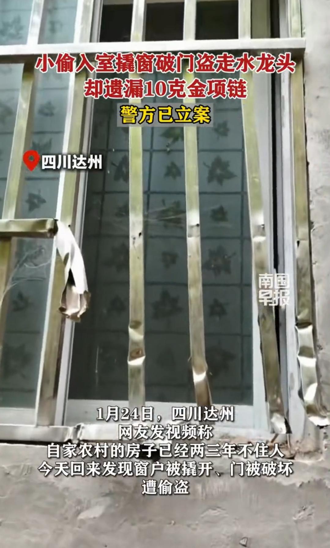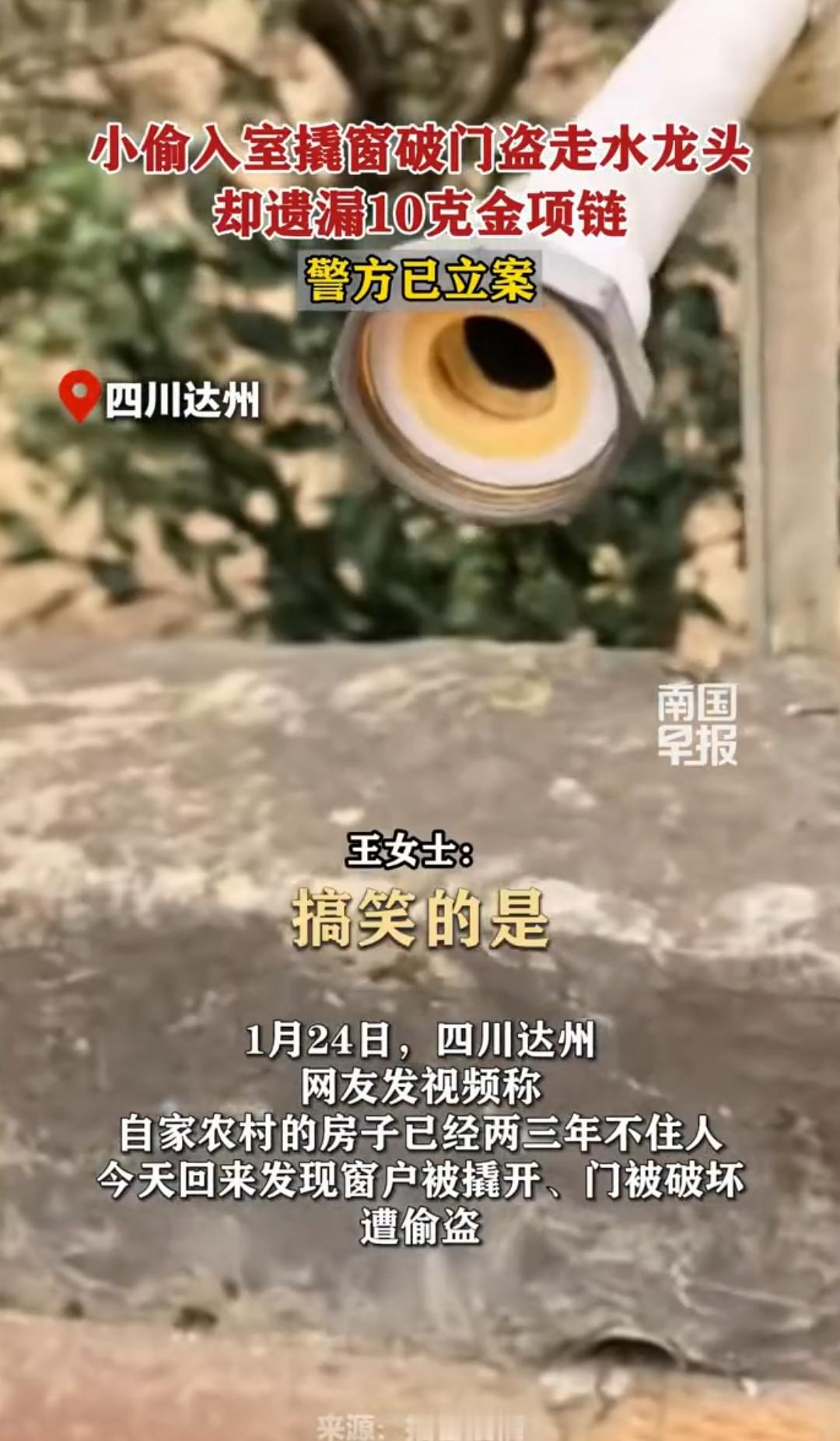 伤害性不高侮辱性极强!四川达州,一女子老家房子一直空着,前不久回家时发现家中被盗,女子吓得立刻搜了一圈,却发现贵重金链没丢,反倒是水龙头被偷走了,女子调侃:这小偷一点也不专业! 王女士介绍,她在农村的老屋两三年没住人了,前几天回去一看,发现窗户和门都被撬了,第一反应就是进了贼,她连忙就想起,屋里还放着一条10克的金链子 她赶紧去翻找,结果链子好好地在原处,压根没被动过。屋里本来也没放现金,清点一圈下来,发现真正丢了的东西特别出人意料,就一个水龙头 王女士自己都觉得有点好笑,忍不住调侃说,这小偷也太不专业了,值钱的金链子不拿,偏偏拆走一个水龙头,图什么呢?她琢磨,可能是对方看见了金链子,但以为是假的,就没要 这事传到网上后,不少人也觉得稀奇。有人猜测,会不会是谁家水龙头坏了,正好看到这房子长期空着,就顺手拆走了?这种人倒未必是职业小偷,可能就是爱占点小便宜 当然,这是往好的方向去想,可如果严格来说,尽管偷的只是水龙头,法律依然会介入。这类行为可以被定义为盗窃罪,偷窃的物品价值虽然不高,但依然符合盗窃罪的构成要件 根据中国的《刑法》规定,盗窃罪是指“以非法占有为目的,秘密窃取公私财物的行为”。即便水龙头的市场价值较低,但如果行为人没有得到房主的允许,而是通过破门撬窗的方式进入并偷走物品,那么他依然构成盗窃。这是一种主观上“非法占有”他人财物的行为,客观上也是“秘密窃取”的行为 不管怎么说,王女士还算幸运,损失不大,但这件事也提醒我们,长期空置的老房子最好还是托邻里照看一下,或者做些简单的防范。哪怕没人住,偶尔回去看看、留点生活痕迹,也能让那些想占便宜的人多些顾忌