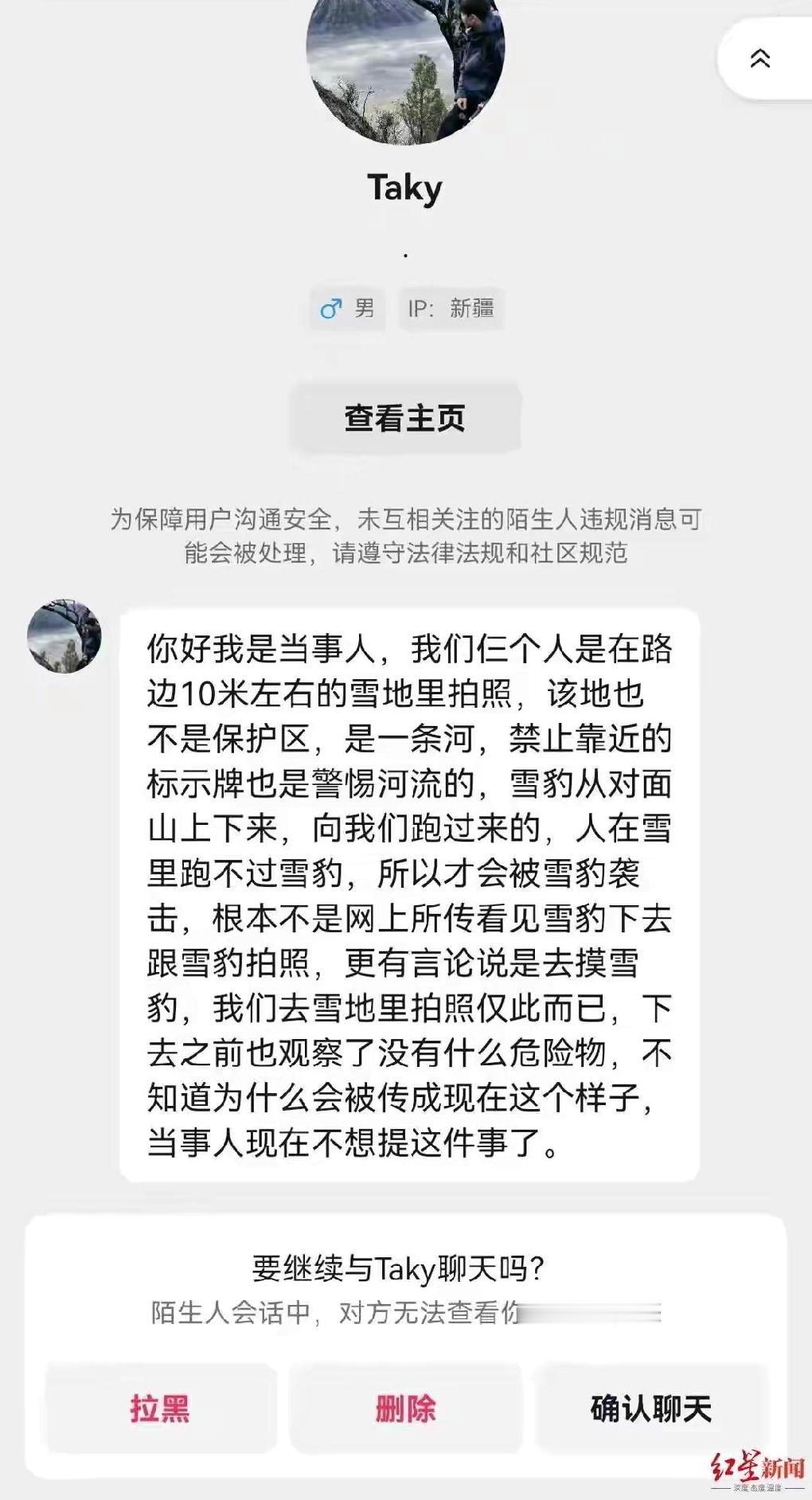 新疆可可托雪豹伤人,最开始传言是因为游客主动靠近雪豹拍照才导致的雪豹攻击,这两天陆续有人发声“澄清”现场情况,说是雪豹主动靠近并发起攻击的,“冤枉”当事人了。 雪豹这类动物一般都是有领地意识的,这应该是常识吧?不是靠近到拍照的距离才会引起它们的攻击意识,进入到它们的领地内,就有可能引发攻击了。现在网络上充斥大量肉食性动物的萌宠视频、图片,这可能弱化了人们对这类野生动物的警惕性,动物园圈养或人类当宠物养的,毕竟野性衰退了很多,但是家狗都有伤人的,更何况野外的呢。去野外景区游玩也该要好好了解当地的情况的,景区也该考虑有没有更多更好的措施防范这类野生动物伤人的可能。