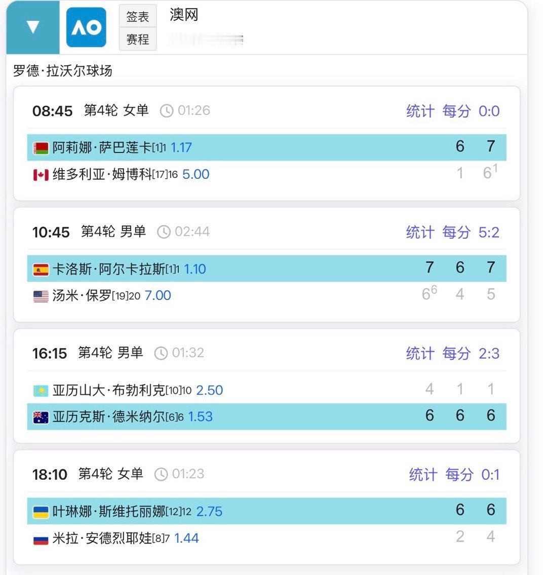 今天意外出局的选手:梅德韦杰夫、安德烈娃都是被横扫……阿尔卡拉斯、萨巴伦卡、高芙都顺利晋级八强这很澳网 澳网2026