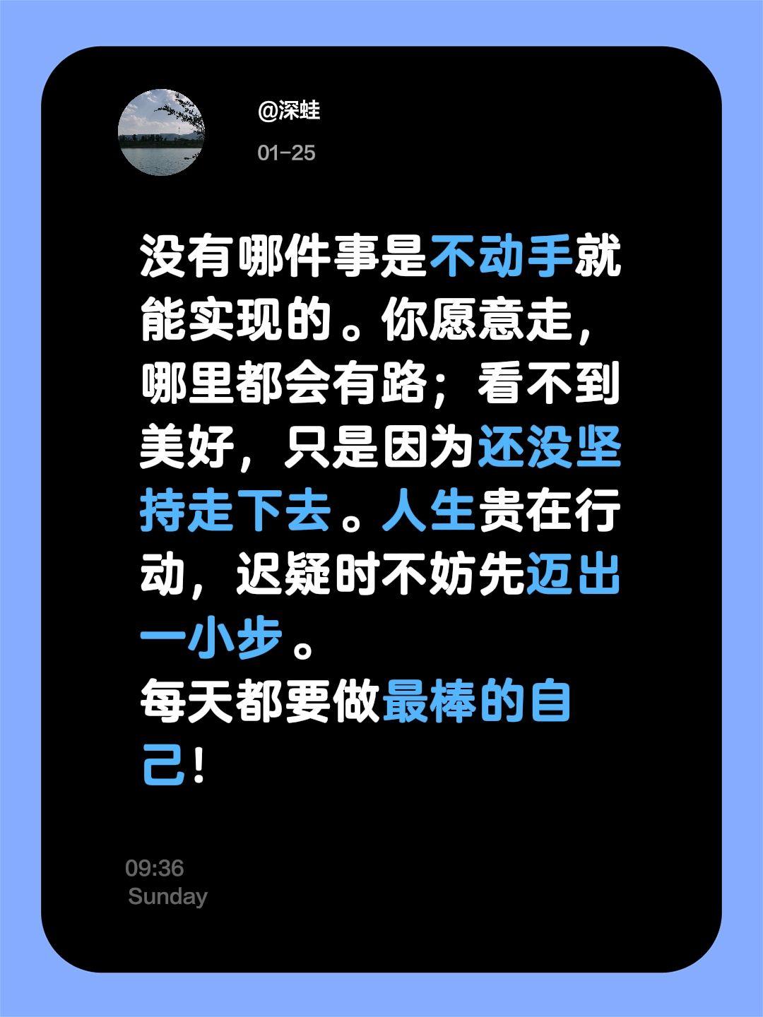 没有哪件事是不动手就能实现的。你愿意走,哪里都会有路;看不到美好,只是因为还没坚持走下去。人生贵在行动,迟疑时不妨先迈出一小步。 每天都要做最棒的自己!