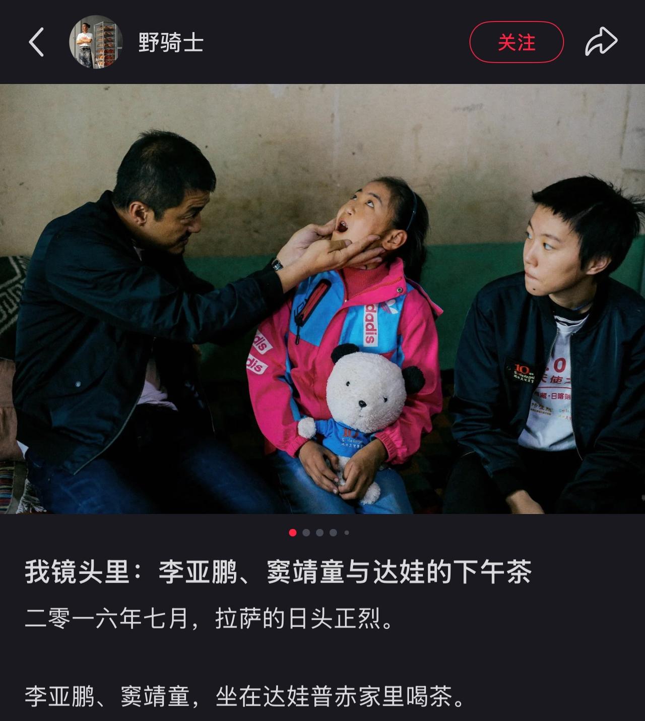 2016年,李亚鹏曾带着女儿窦靖童奔赴拉萨看望治愈的唇腭裂的小姑娘。 2014年,这位西藏小姑娘通过嫣然医院实施了唇腭裂手术,期间费用全免,手术效果非常不错,从照片来看,小姑娘甚至连手术痕迹都没有留下,看上去与正常小女孩没有任何差别。 这次前来,李亚鹏还亲自查看了小姑娘的唇腭处,看到恢复效果非常理想,才彻底放下心。 不仅于此,小姑娘还收到了一辆心心念念的自行车,照片中,窦靖童还骑车带妹妹兜风,两个姑娘的笑容是这样的温暖。 另外的照片中,小姑娘飞奔过去抱住了李亚鹏叔叔,这一幕场景让太多人为之动容。 最后还是要感慨,这位拍照的摄影师真的非常优秀,镜头语言是这样的真挚细腻,一切都在不言中。