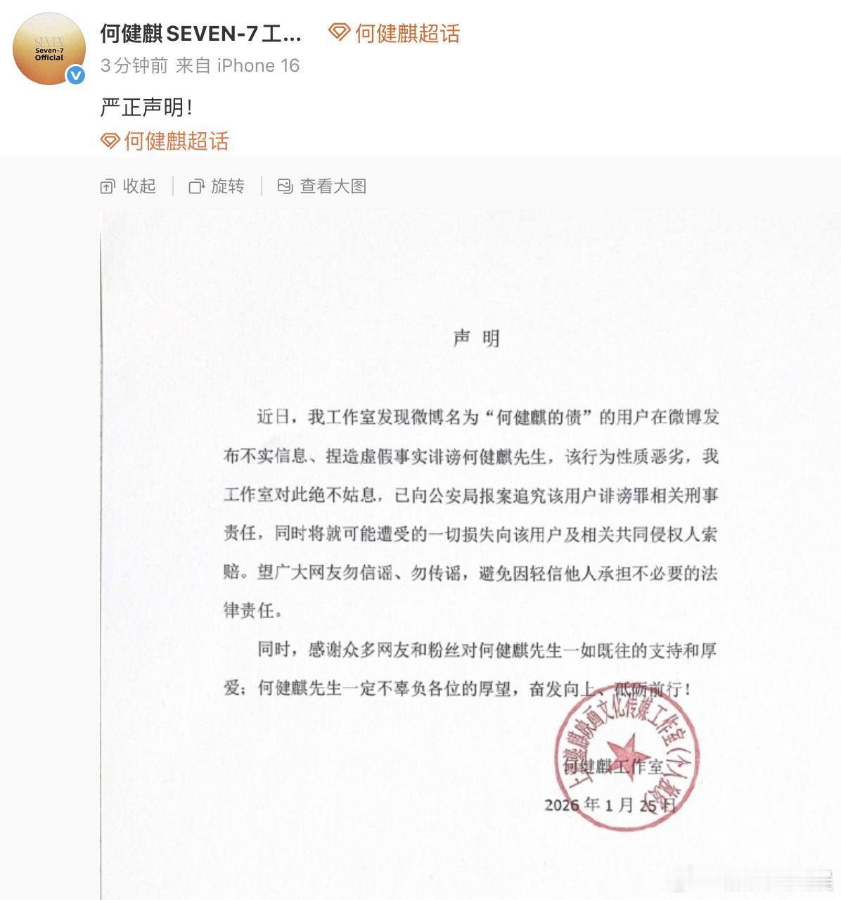 何健麒工作室声明 25日晚,有自称何健麒前女友的网友“何健麒的债”实名举报何健麒
