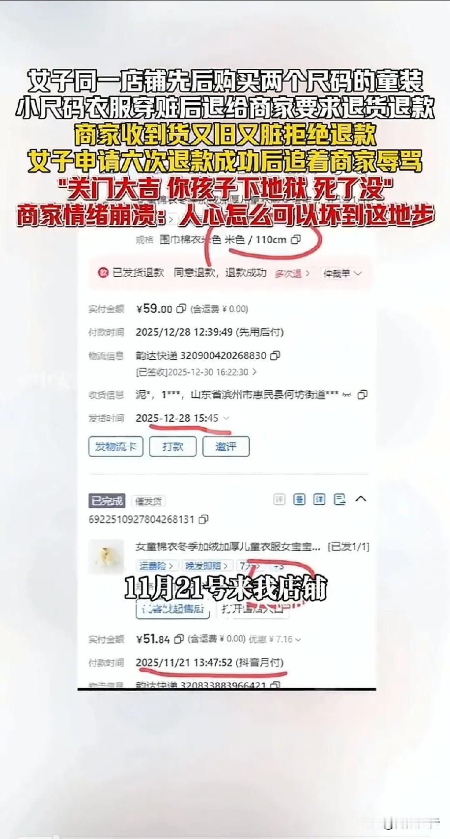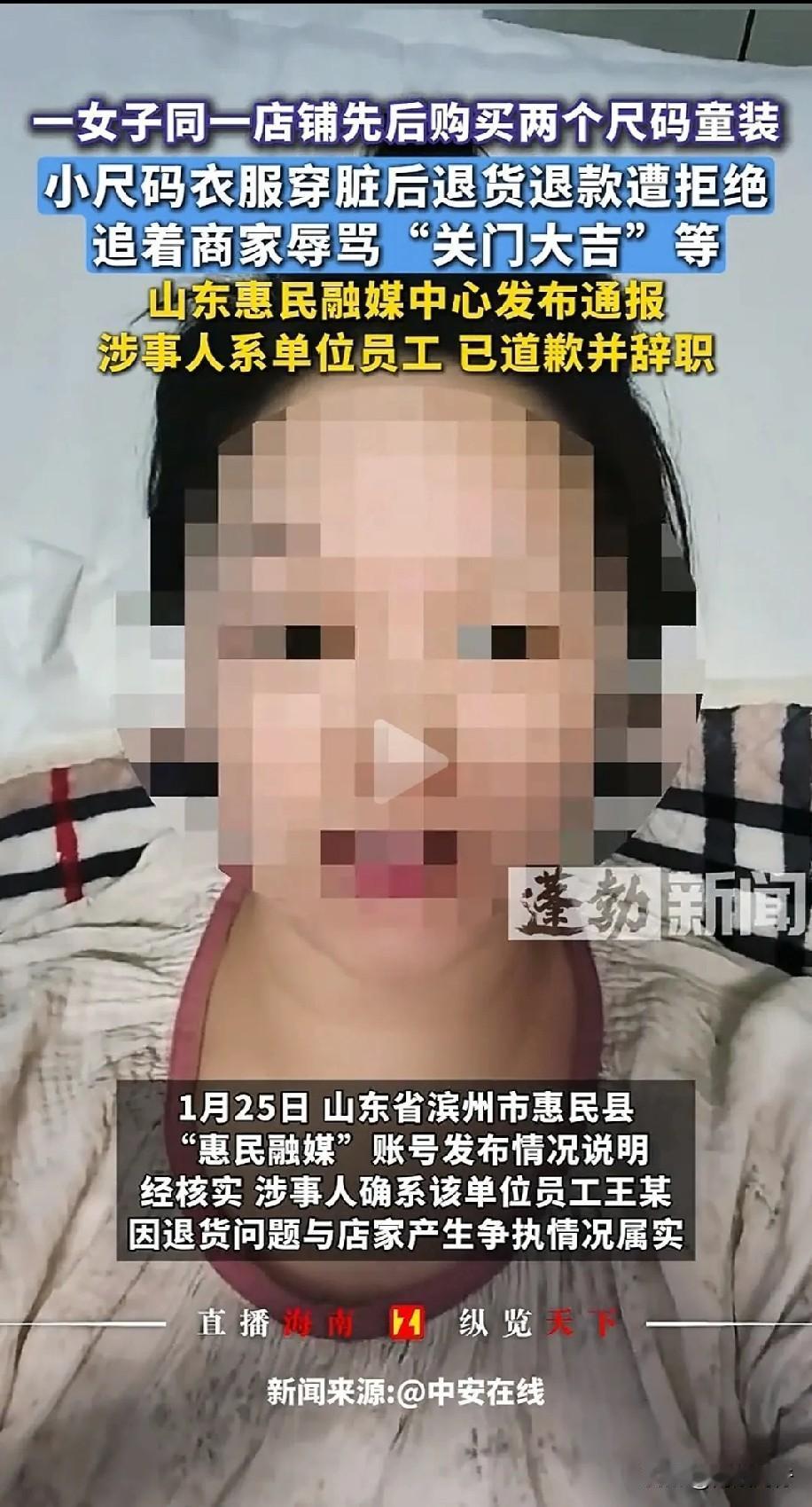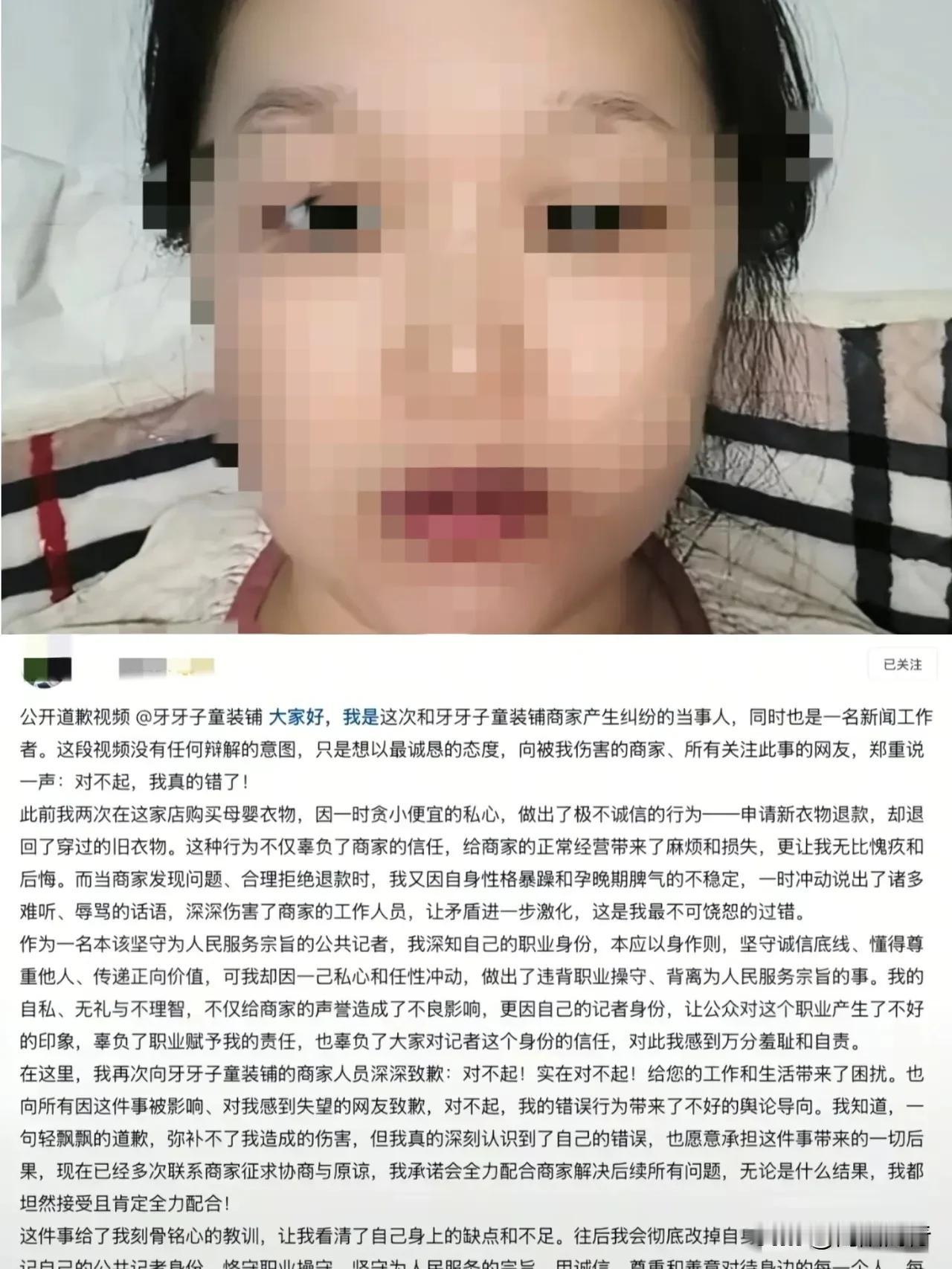 记者竟用孩子旧衣服冒充新的退货,被发现后还连续辱骂商家6天。山东惠民县这位王女士的操作,真是让人看不懂。 身为融媒体中心记者,本该以身作则,却为了点小便宜耍小聪明,被拆穿后不仅不认错,还仗着孕晚期当“免罪金牌”。道歉信里句句找理由,压根没意识到问题核心是自私自利、不尊重他人。 做人最基本的底线就是诚信,职业身份从来不是特权。占便宜或许能得一时好处,丢的却是一辈子的口碑。 你们觉得孕晚期能成为犯错的借口吗?遇到这种退货乱象该怎么应对?来评论区聊聊~