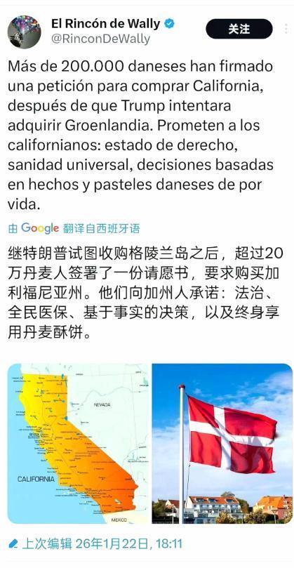 丹麦提出要购买美国加利福尼亚州。超20万人签署请愿书要求购买加利福尼亚州,并给出全民免费医保,以及终生享用丹麦酥饼的福利条件。这项提议被视为是对美国觊觎格陵兰岛的反击,此前特朗普曾向格陵兰岛居民喊话,称若是超过60%的人公投加入美国,则向所有格陵兰岛人每人发放100万美元。 丹麦人这波操作,全是被美国逼出来的。特朗普再度入主白宫后,就没停下对格陵兰岛的惦记,不光多次放话要收购,还直接向格陵兰岛居民喊话,说只要超过60%的人公投同意加入美国,就给岛上每个人发100万美元。 这话听着诱人,本质就是用金钱施压,无视丹麦的主权和格陵兰岛居民的真实意愿。 格陵兰岛是世界最大岛屿,面积约216万平方公里,名义上归丹麦管辖,实际享有高度自治。美国眼馋它不是一天两天,核心就是两个原因。 一是地理位置关键,作为北极地区的战略支点,能扼守北大西洋和北冰洋的航道,气候变暖后这条航道的军事、经济价值越来越高,还是北美防空的重要前哨。二是资源丰富,岛上藏着大量稀土、铜、镍、石墨等矿产,都是芯片制造、能源转型必需的核心资源,对美国掌控全球产业链意义重大。 美国早就不满足于口头惦记,实际动作不断。按美丹之前的安全协议,美军在格陵兰岛已有多个军事基地,驻军数量远超丹麦本土部队,还享有不受限制的军事行动权和治外法权。 近期特朗普又在达沃斯论坛上宣称,和北约秘书长吕特达成了关于格陵兰岛的协议框架,要在岛上部署“金穹”导弹防御系统,还要拿到矿产资源的优先采购权,美其名曰“全面准入权限”,还说不用给丹麦一分钱。 这番操作直接触碰了丹麦的底线。丹麦首相明确表态,格陵兰岛主权是红线,绝不谈判,北约秘书长也无权代表丹麦谈这事。 格陵兰岛自治政府总理也站出来,说直到特朗普改口前,岛上民众一直承受着被武力夺取的压力,明确选择站在丹麦和欧盟这边,资源合作可以谈,但主权绝不让步。 欧洲多国也对此不满,欧盟外交代表直言跨大西洋关系因此受了重大打击。 请愿书就是在这样的背景下冒出来的,发起者是瑞士网友泽维尔·杜瓦特和他的朋友,在丹麦迅速获得广泛支持。 他们算准了特朗普和加州的矛盾——特朗普曾骂加州是“美国最糟糕的州”,常年和加州领导人不和,所以调侃只要价格合适,特朗普说不定真愿意卖掉加州。 这种以其人之道还治其人之身的方式,比官方抗议更接地气,也更戳痛点。 有意思的是,这波戏谑还得到了不少美国网民的支持。很多美国人直言,丹麦开出的全民医保太有吸引力,早就受够了本国政府不顾民生、朝令夕改的作风,甚至有人喊话希望丹麦也考虑收购自己所在的州。 这也从侧面反映出,美国民众对政府的霸权行径和国内民生问题的不满。 要知道,加州可不是普通州。2024年它的GDP达到4.1万亿美元,超过日本成为全球第四大经济体,单独拎出来比很多国家都强。 这里有硅谷的科技巨头,苹果、谷歌、特斯拉都扎根于此;农业也厉害,用全美1%的耕地产出了35%的蔬菜和66%的水果坚果,每年农业产值近600亿美元;好莱坞更是掌控着全球娱乐产业的话语权。 这样一块香饽饽,丹麦民众当然知道买不来,核心就是用玩笑戳破美国的霸权逻辑。 美国一直抱着“门罗主义”的扩张思维,只许自己在美洲乃至全球圈地,不许别人说半个不字。对格陵兰岛,一边放话给钱诱惑,一边威胁军事胁迫、加征关税,转头又改口说不动武不加税,反复无常全看自身利益。 丹麦民众的请愿书,就是用最幽默的方式说破这种双重标准:你能惦记别人的地盘,别人就不能调侃你的黄金州? 目前来看,这份请愿书很难有实际结果,众筹1万亿美元也不现实。但它的意义早已超出事件本身,成为民间对美国霸权的一次集体吐槽。 格陵兰岛的争端也没结束,美国虽然暂时调整了战术,不再提主权转移,但部署反导系统、扩大军事存在的心思没变。欧洲国家一边依赖北约保护,一边又不想纵容美国的扩张,只能在妥协中寻找平衡。 说到底,这事儿就是一场霸权与反制的缩影。美国总想用实力和利益碾压别人,却忘了再强的霸权也经不起荒唐的挑衅。丹麦民众一张请愿书,几句玩笑话,就把美国的野心衬得格外滑稽。 至于格陵兰岛的未来,还有待观察,但可以肯定的是,谁也不会心甘情愿把家园拱手让人,美国的如意算盘,未必能打响。