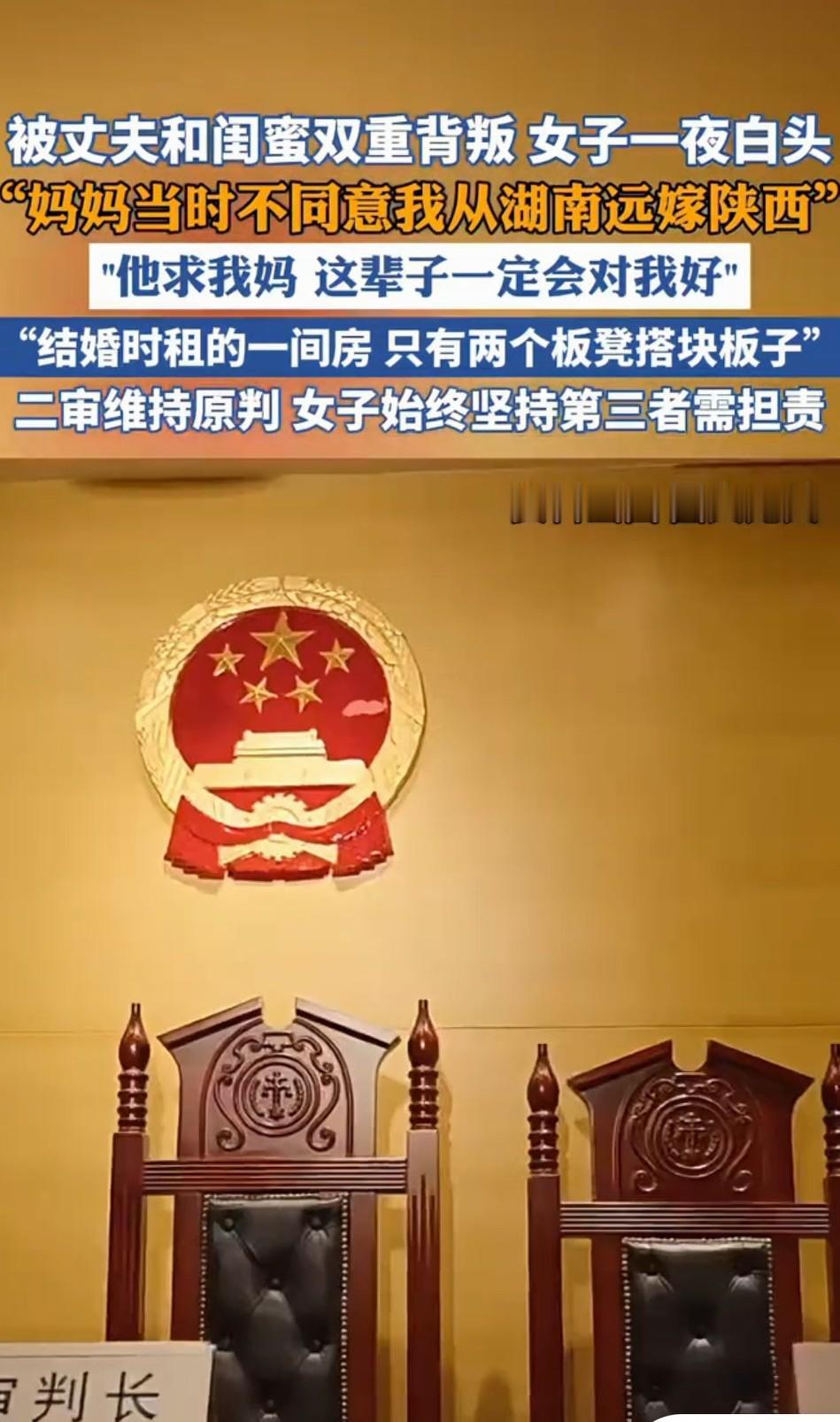 远嫁20年遭丈夫和闺蜜背叛,一夜白头!一年打13场官司,最新判决来了 我在基层干了二十几年,见惯了家长里短的纷争,却还是被郭女士的经历戳中了心。 从湖南远嫁陕西,她和丈夫白手起家相伴近20年,从租房度日到有车有房,熬过了苦日子,却没躲过身边人的背刺。 睡在枕边的丈夫,掏心掏肺的闺蜜,两人竟长期以夫妻名义同居,更过分的是,还逼着她的亲生儿子喊第三者“妈妈”。 巨大的精神打击,让她一夜白头,那个风风火火的“场子姐”,转眼成了满脸憔悴的“白头婆”。 她没有忍气吞声,选择硬刚到底。2023年一年时间,她接连打了13场官司,从重婚罪刑事诉讼,到夫妻共同财产民事追回,每一步都走得身心俱疲。 2023年一审,法院认定丈夫构成重婚罪,判处有期徒刑6个月,可第三者却未被追究任何责任。 2025年6月二审,她的上诉被驳回,原判维持,这份不公,让她更坚定了讨说法的决心。 好在,正义虽迟但到。2025年12月29日,另一起民事案件二审判决出炉:第三者潘某,必须全额返还擅自收受的4万余元夫妻共同财产! 这4万块,抵不上她几年奔波的路费和律师费,却成了最有力的回应:婚姻里的共同财产,从不是个人私产,更不能随意送给情人;破坏别人家庭的行为,终究要付出代价! 如今,郭女士依旧在坚持申诉,她要的从来不是钱,而是让第三者也为重婚行为担责,让所有背叛者知道,做错事,就该有后果! 婚姻的根基是忠诚,家庭的温暖靠守护。最狠的伤害,从来都来自最亲近的人,一次背叛,毁掉的是半生情分,一个家庭。 心软换不来珍惜,纵容只会换来得寸进尺,遇人不淑时,硬刚到底才是对自己最好的保护。 面对丈夫和闺蜜的双重背叛,你觉得郭女士的坚持值得吗? (内容取材网络) 点亮〔收藏和赞〕你我共同成长