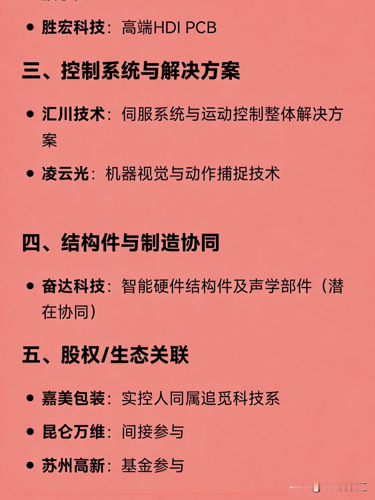 魔法原子机器人概念相关企业汇总 一、核心零部件 绿的谐波:谐波减速器 双环传动:RV减速器 鸣志电器:伺服电机 江苏雷利:空心杯电机 卧龙电驱:无框力矩电机及关节驱动模组 五洲新春:机器人关节轴承 汉威科技:柔性触觉传感器(电子皮肤) 二、芯片与电子系统 全志科技:主控芯片 芯联集成:高集成电驱控芯片(联合开发 + 股东) 胜宏科技:高端HDI PCB 三、控制系统与解决方案 汇川技术:伺服系统与运动控制整体解决方案 凌云光:机器视觉与动作捕捉技术 四、结构件与制造协同 奋达科技:智能硬件结构件及声学部件(潜在协同) 五、股权/生态关联 嘉美包装:实控人同属追觅科技系 昆仑万维:间接持有 苏州高新:基金参与