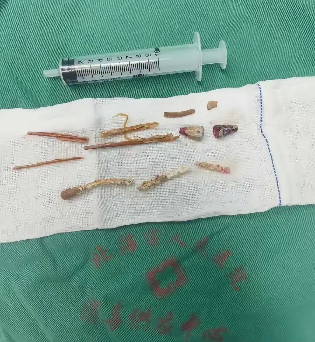 我也是服了!广东一男子尿道内居然取出:圆筒状、笔芯状、竹签状异物!20年的这些异物,被医生给取出来了。。 大家都被这个特殊的病历惊呆了。 连见多识广的医生,也是惊讶不已。 大家看看医生给的图片。 这长长短短的,感觉都是木头棍棍。 真是大千世界无奇不有,这可是塞进尿道呀。 近日,广西北海市人民医院收治一名中年男性患者。 男子的病因是,肾结石合并肾脏脓肿。 可是,医生再给他进一步检查时,又发现了新大陆。 检查做的越多,病人身上发现的内容让医生越惊讶。 做检查时,医生发现,病人的尿道内存在大量长年存留的异物。 再继续检查,又发现了两个状如笔帽头的圆筒状异物。 再继续往后检查,病人尿道后方还有大量疑似结石的堆积物。 看着这些检查出来的内容,医生也是忐忑。 医生是第一次见到尿道里面这么多异物。 这么多异物,手术也是一种挑战。 医生艺高人胆大。 医生很快给病人做了手术。 当医生取出这些异物后,才发现这些异物,奇奇怪怪,弯弯曲曲。 有几段类似圆珠笔芯的异物,最长的一段约4厘米,短的有2厘米。 还有一段树枝样的异物。 还有竹签一样的异物。 这些圆筒状,笔芯状,竹签状异物,已经在病人身体内20年。 医生用了三个小时的手术时间,总算把病人身体内,所有异物都成功“拆除”。 这个病例太特殊了。 这些异物在病人身体内呆了20年,不知道病人咋忍受这些异物的。 我就好奇,这些异物是怎样进入病人身体内的? 医生说,手术后病人恢复良好,长期排尿不适的症状得到改善。 医生医术高明,给病人治疗好了的病痛。 这些异物在病人体内已存20年,这个病人的忍受力很强啊。 不过,有病就要看医生,把病掐在萌芽期,才是上策,别等20年再看医生,黄瓜菜也凉了。