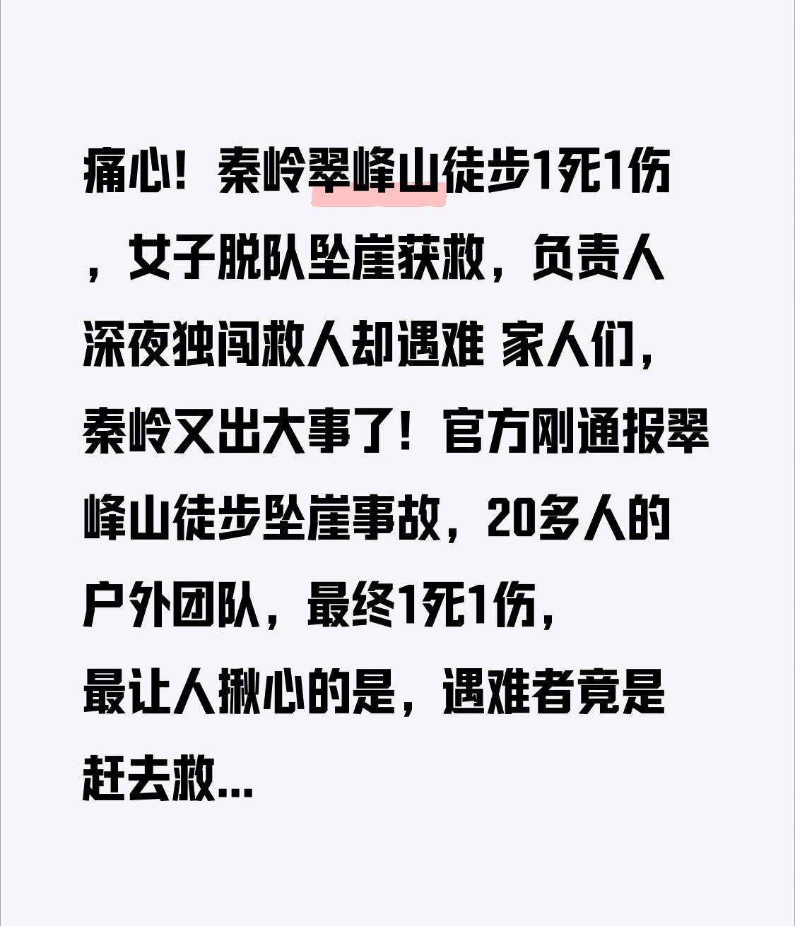 痛心!秦岭翠峰山徒步1死1伤,女子脱队坠崖获救,负责人深夜独闯救人却遇难 家人们,秦岭又出大事了!官方刚通报翠峰山徒步坠崖事故,20多人的户外团队,最终1死1伤,最让人揪心的是,遇难者竟是赶去救人的活动负责人!这起悲剧里,藏着两个让人泪目的转折,更给所有户外爱好者敲碎了警钟! 1月17号,西安某户外组织带20多人去周至县翠峰山徒步,本来是场放松的山野之旅,没想到半路出了意外。一名李姓女子觉得常规路线不过瘾,竟然脱离大部队,自己找了条野路穿行。当时山上结冰路滑,坡度接近70度,她脚下一滑直接摔进了山谷,幸好同行者听到呼救及时报警。 第一波转折来了:救援队伍连夜集结,应急管理局、消防、蓝天救援队还有当地村民齐上阵,顶着零下15℃的低温和6级阵风搜救。第二天就找到了李某某,还动用直升机把她送下山,万幸她只是轻伤,当天就回了西安家。大家本以为事情告一段落,可更揪心的消息接踵而至——活动负责人孟某某听说队员出事,当晚从西安连夜赶去周至,没等救援队伍安排,就独自绕道上山救人,结果彻底失联! 接下来的7天,救援人员顶着恶劣天气,用人工、设备甚至直升机展开地毯式搜寻。翠峰山沟壑纵横,很多地方没信号,GPS都失灵,搜救队每天在齐膝深的积雪里艰难推进,甚至有救援队员差点滑倒坠崖。可直到1月24号,他们才在一处崖壁下找到孟某某,遗憾的是,他已经没有了生命体征。社交平台上,很多认识孟某某的驴友都在追忆他,说他人品好、户外经验丰富,谁也没想到会以这样的方式离开。 其实这起悲剧本可以避免!李某某如果不擅自脱队走野路,就不会坠崖;孟某某如果不盲目独自施救,而是配合专业救援,也不会付出生命代价。更关键的是,翠峰山虽然不是禁穿区,但冬季路面结冰、小气候多变,局部大雾说来就来,很多“老驴”都容易迷路,可还是有人心存侥幸。 近年来秦岭户外事故频发,2025年就有20多起被困失联事件,大多和“脱队”“装备不全”“盲目施救”有关。专业人士早就提醒:徒步不是冒险,卫星手机、保温毯、登山杖这些保命装备不能少,更不能把“非禁穿”当成“低风险”。 一条鲜活的生命就这样留在了秦岭,留给家人无尽的悲痛。户外的意义是感受自然,而不是挑战危险。希望这起悲剧能唤醒所有徒步爱好者:敬畏自然,遵守规则,不擅自行动,不盲目施救,安全回家才是每一次出发的终极目标。你怎么看待这起事故?你徒步时遇到过危险吗?评论区聊聊你的看法,点赞转发,让更多人记住这个血的教训!