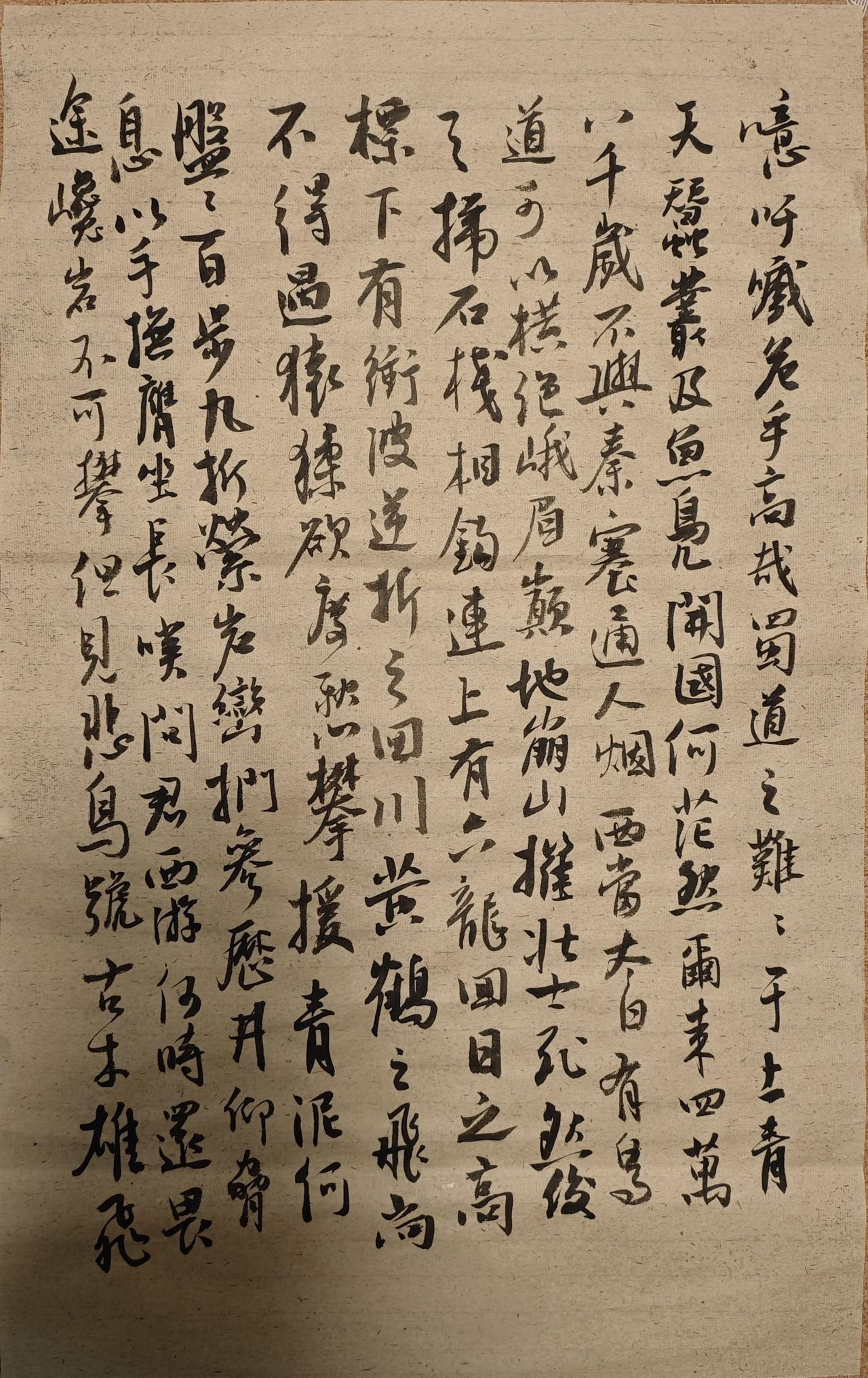 噫吁嚱,危乎高哉! 蜀道之难,难于上青天! 蚕丛及鱼凫,开国何茫然! 尔来四万八千岁,不与秦塞通人烟。 西当太白有鸟道,可以横绝峨眉巅。 地崩山摧壮士死,然后天梯石栈相钩连。 上有六龙回日之高标,下有冲波逆折之回川。 黄鹤之飞尚不得过,猿猱欲度愁攀援。 青泥何盘盘,百步九折萦岩峦。 扪参历井仰胁息,以手抚膺坐长叹。 问君西游何时还?畏途巉岩不可攀。 但见悲鸟号古木,雄飞雌从绕林间。 又闻子规啼夜月,愁空山。 蜀道之难,难于上青天,使人听此凋朱颜! 连峰去天不盈尺,枯松倒挂倚绝壁。 飞湍瀑流争喧豗,砯崖转石万壑雷。 其险也如此,嗟尔远道之人胡为乎来哉! 剑阁峥嵘而崔嵬,一夫当关,万夫莫开。 所守或匪亲,化为狼与豺。 朝避猛虎,夕避长蛇,磨牙吮血,杀人如麻。 锦城虽云乐,不如早还家。 蜀道之难,难于上青天,侧身西望长咨嗟! 李白 蜀道难 写字是一种生活
