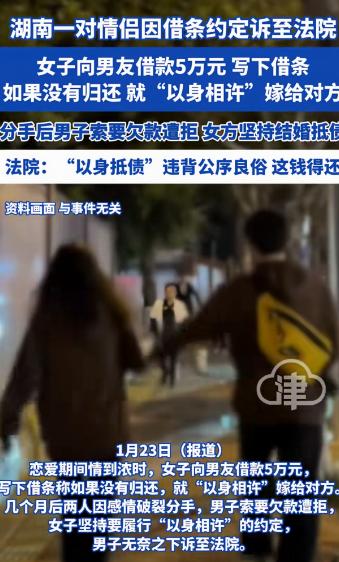 笑死!湖南,一对情侣恋爱时,女子管男友借了50000块钱,男友让她写张欠条,如果不还怎么办,女子承诺如果还不上就以身相许,没成想,两人分手后,男友索要欠款,女子却表示,要钱没有,我可以以身相许!最终男友将其告上法庭 先给大家捋个离谱前提:情侣间借钱写借条很正常,但你见过借条里加 “以身相许” 条款的吗?益阳这对相亲认识的情侣,就把这事干得明明白白,最后闹上法院,结局既在意料之中,又让人忍不住想笑。 男主角化名刘强,益阳本地人,三十好几的年纪,工作稳定但婚姻大事一直悬着。 家里长辈催婚催得比闹钟还准时,逢年过节必开启 “灵魂拷问”,逼得他在相亲平台上碰碰运气。 缘分这东西也怪巧,刘强很快就在平台上刷到了化名李茜的女子。 两人年龄差不多,住得也近,线上一聊就停不下来,从美食爱好聊到未来规划,句句都能说到一块儿去。 热聊半个多月后,自然就约了线下奔现。 奔现没翻车反而甜度升级,两人相处起来毫无尴尬感,吃饭逛街都有说不完的话,对彼此的印象都特别好。 没绕什么弯子,相处没多久就正式确立了恋爱关系,刘强还悄悄盘算着,这次说不定真能定下来了。 可甜蜜日子没过仨月,考验就来了。 李茜突然找到刘强,一脸焦急地说自己资金周转出了问题,急需 5 万块钱救急,还拍着胸脯保证,等资金盘活了马上就还,绝不给刘强添麻烦。 5 万对普通上班族来说不是小数,刘强当场就犯了难。 不借吧,俩人正处于热恋期,怕伤了感情;借吧,毕竟认识时间短,感情基础还浅,心里实在没底,就怕钱借出去收不回来。 李茜也看出了刘强的纠结,主动提出要写张借条,语气特别诚恳:“写张借条咱们都放心,我也不是那种借钱不还的人。” 见她态度这么主动,刘强心里的顾虑少了大半,当即就点头答应了借款。 重点来了!提笔写借条时,李茜突然加了一条让人跌破眼镜的条款:“若到期未能还清 5 万欠款,本人自愿以身相许嫁给刘强,该笔借款自动转为彩礼,借条自款项到账之日起生效。” 刘强一看这条款,只当是情侣间的甜蜜情话,压根没往法律层面想,也没觉得这约定能作数。 他笑着点头认可,当场就通过手机银行转了钱,那张写着奇葩条款的借条,也只是随手塞进抽屉,没当回事。 钱借出去后,俩人的感情就开始走下坡路。李茜绝口不提还款的事,刘强偶尔委婉问一句,她也总找各种借口推脱。 一来二去,俩人矛盾越来越多,从还款争执到生活琐事,吵得越来越凶,感情也被耗得干干净净。 相处满半年时,俩人都觉得这段关系没法继续了,干脆利落地和平分手。 本以为好聚好散,可刘强一提起那 5 万块钱,李茜的操作直接把他看傻了 —— 她竟说自己没钱还,但愿意履行借条约定,和刘强领证结婚抵账。 李茜还理直气壮地辩解,说这是当初白纸黑字定好的约定,自己不是耍赖,只是按承诺办事。 这话直接把刘强气炸了,他虽想结婚,但绝不可能接受这种捆绑债务的婚姻,当即就拒绝了,还怀疑李茜从一开始就是骗钱。 协商了好几次都没结果,刘强彻底死了心,整理好借条、转账记录等证据,一纸诉状把李茜告到了益阳市赫山区人民法院。 其实这类案子不算少见,之前湘阴县法院就判过一起,男方给网恋女友转账 380.68 万,分手后女方称款项为赠与,法院扣除 20.68 万合理赠与款项及女方已还款项后,最终判决女方返还男方 356.3 万余元。 法院审理后明确表态,婚姻是自愿的人身关系,不能和债务捆绑,“以身相许” 的约定违背公序良俗,依据《民法典》第一百五十三条属无效条款。 但借贷关系真实有效,最终判决李茜偿还 5 万借款,双方均未上诉,判决已生效。 一场荒唐闹剧落幕,也给所有情侣提了个醒:谈钱别搞模糊约定,免得钱情两空。 如果各位看官老爷们已经选择阅读了此文,麻烦您点一下关注,既方便您进行讨论和分享,又能带来不一样的参与感,感谢各位看官老爷们的支持!