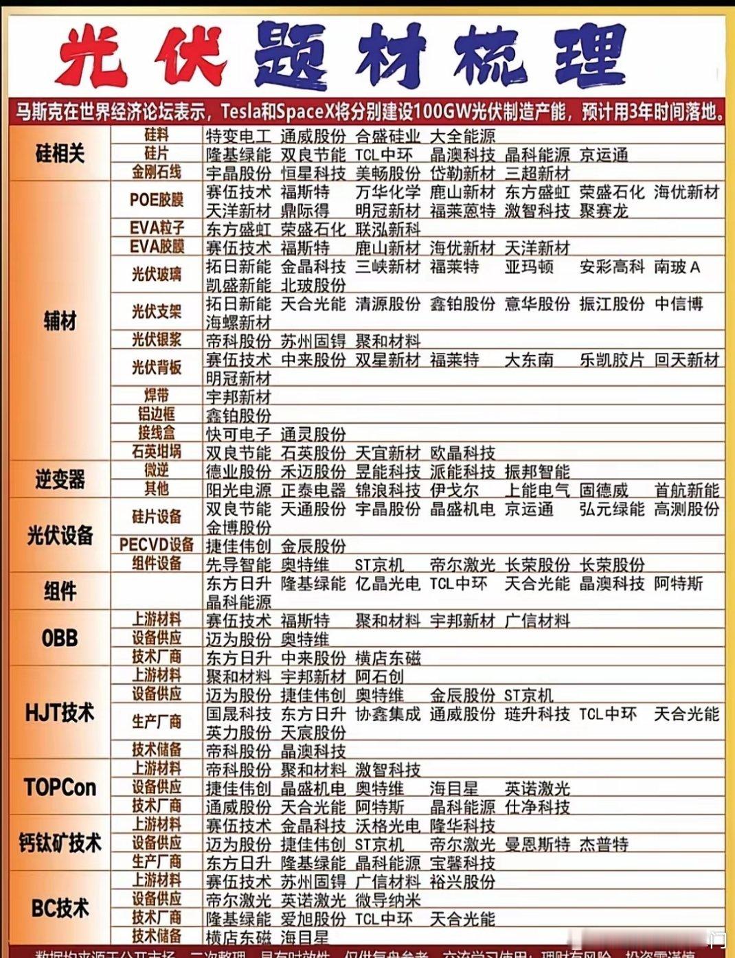 光伏产业风口来袭,马斯克布局带动硅片、胶膜、玻璃等上下游走高,新技术落地提速,关注优质标的同时需警惕投资风险。