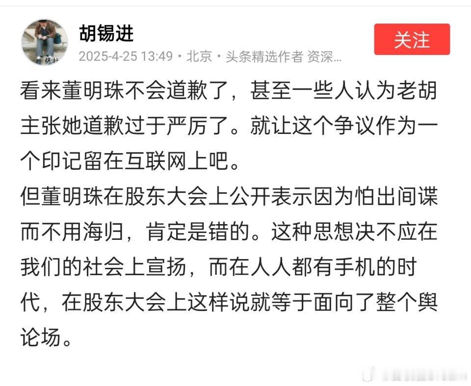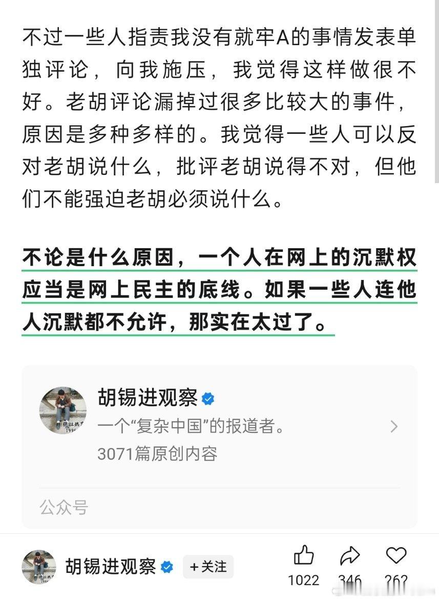 🔻老胡要求有沉默权,那希望别人保持沉默的时候,老胡也能这么包容,而不是写文章要求别人道歉。胡锡进就牢A斩杀线发评论