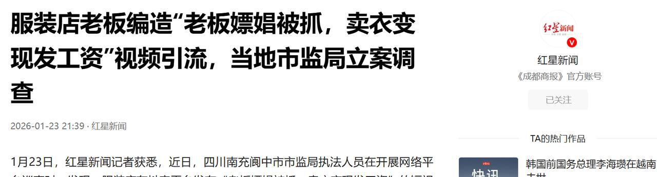 “太离谱了!”近日,四川阆中,一服装店的“员工”为促销卖羽绒服,竟拍视频称“老板嫖娼被抓,甩卖衣服变现发工资”,甚至开启直播!顿时引起一大批网友的关注。相关部门调查后发现,发现这位员工其实就是老板本人,网友:为卖货已经开始给自己造谣了,太狠了! 本来是深夜刷视频打发时间,结果刷到一段魔幻的画面,四川阆中一家服装店里,满地都堆着像小山似的羽绒服,镜头前的女人扯着嗓子喊,那声嘶力竭的架势,跟直播喊麦似的,仿佛在抓住最后一根救命稻草。 她嘴里说的话更是劲爆,直接抛出了一个让人跌破眼镜的剧本,老板因为嫖娼被抓了,店里资金链断了,工资都发不出来,她作为员工走投无路,只能把店里的男装羽绒服通通甩卖,一件只要99块。 这话一出来瞬间就抓住了大家的眼球,熟悉的配方像极了二十年前街头大喇叭里喊的“江南皮革厂倒闭了”,都是靠悲情梗加八卦料博关注,偏偏赶上1月下旬,正是春节前大家忙着采购、又爱贪点小便宜的时候,这剧情精准戳中了人们的猎奇心和捡漏心理。 视频很快就爆火,点击量蹭蹭往上涨,直播间里涌进了成千上万等着捡漏的网友,还有不少当地人事事当真,特意跑到线下门店去围观,一时间店里的销量也跟着涨了起来,积压的库存眼看着动了起来。 本以为这是一场员工讨薪的悲情逆袭戏,结果没等热度降下来,反转就猝不及防地来了,流量是把双刃剑,不仅吸引了想买衣服的顾客,也被负责网络巡查的市场监管局执法人员刷到了,执法人员带着疑问上门核查,本来还做好了面对劳资纠纷、安抚讨薪员工的准备,可一推开店门,看到的场景却让所有人都傻了眼,甚至透着一股荒诞的可笑。 哪里有什么被抓的老板,哪里有什么走投无路的讨薪员工?那个在镜头前声泪俱下卖惨的女人,压根不是什么员工,她就是这家店的老板本人,面对执法记录仪,这位自导自演的“大戏导演”再也装不下去了,只能尴尬地坦白了真相。 原来今年冬天羽绒服生意格外难做,眼看春节就要到了,店里积压了大量库存,她愁得睡不着觉,怎么都卖不动货,为了尽快清库存、把货换成钱,她也是急疯了,思来想去竟动了歪心思。 她知道正儿八经打折促销没人在意,可“老板嫖娼被抓”这种低俗八卦,绝对是能引爆流量的密码。于是她干脆把自己包装成受害者,编造了一个根本不存在的“嫖客老板”,想用这种博眼球的道德审判戏码,换取商业上的变现,哪怕是往自己头上扣难听的帽子也不在乎。 她倒是靠着造谣赢了一时的流量和销量,却彻底输了法理和底线,这种把消费者当傻子耍、拿低俗谣言当营销手段的行为,从来都不是什么无伤大雅的恶作剧,《广告法》和《网络反不正当竞争暂行规定》早就划好了红线,网络空间也不是谁想造谣就能造的垃圾场,不能为了卖几件99块的羽绒服,就毫无底线地突破规则。 目前阆中市市场监管局已经对此事立案调查,这场荒唐的营销闹剧,最终以“老板自己把自己查办了”收场,想想也是又好气又好笑,不少人都在感慨,她有这份对自己“下狠手”的劲头,要是用在提升产品质量、琢磨正经营销上,也不至于靠造谣博眼球。 现在这个算法主导的时代,我们见过太多为了流量毫无底线的剧本,可这次阆中这家服装店的操作,还是刷新了认知,说到底虚构的惨剧终究换不来长久的利益,反而会引火烧身,酿成真实的悲剧,不是老板被抓,而是店铺被查、口碑尽毁。做人做事还是得守好底线,靠造谣博来的流量,终究是镜花水月。